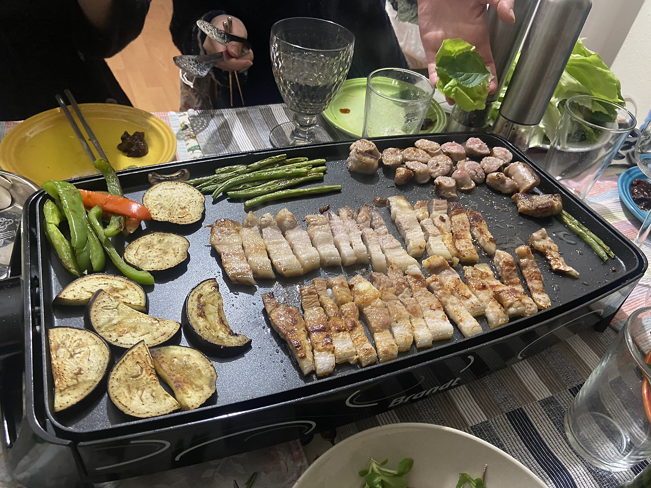 먼저, 내가 싸 온 새우스캄피에 바게트를 함께 먹으며, 가벼운 와인으로 시작하고 한 명이 사 온 새우도 그릴에 구우며 바비큐를 시작한다. 맨 처음으로는 기름기가 적은 내가 사 온 소고기로 시작을 하였다. 가지, 버섯, 파프리카도 곁들인다. 그러다가 이제 본격 삼겹살 타임이 되었다. 세 명이나 삼겹살을 사 와서 삼겹살이 넘치는데, 삼겹살을 굽기 시작하자 본격적인 코리안 바비큐가 시작된 느낌이었다. 고기에서 나오는 기름에 채소들도 구워지니 채소도 더욱 맛있고, 지글거리는 소리는 정겨웠다. 내가 챙겨 온 쌈장과 고추냉이도 역시 삼겹살과 궁합이 최고였고, 이 날의 호스트가 집에서 키웠다는 귀한 깻잎을 인당 두 장씩이나 나눠줘서, 한국을 떠난 지 일 년 만에 깻잎을 맛볼 수 있었다. 한국 노래가 배경에 깔리고 한국인들의 대화 소리가 들리는 와중에 깻잎에 삼겹살 하나 올리고, 쌈장을 곁들여 먹으니 이곳은 거의 한국이었다. 지금까지 먹던 삼겹살의 아쉬움이 모두 충족되는 순간이었다. 삼겹살은 역시 앞에 그릴을 두고 구워 가위로 잘라서 하나하나 가져가서 먹는 그 감성이 있다. 모두가 둘러앉아 함께 구워 먹는 이것이 진정한 코리안 바비큐다. 이 함께하는 감성이 그리웠던 것 같다. 계속해서 마시는 와인도 좋고 모든 게 만족스러운 하루였다. 삼겹살은 역시 우리 한국인의 소울푸드다.