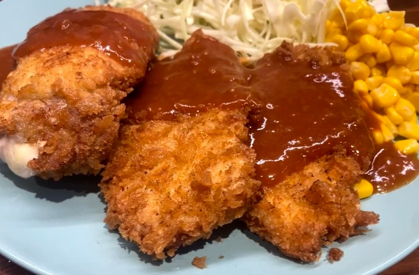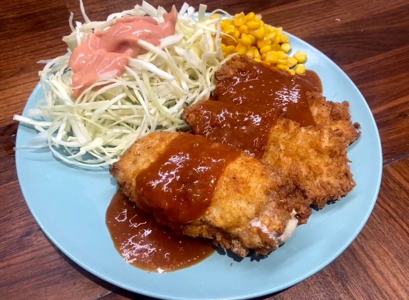한국에 있을 때는 돈가스 소스를 마트에서 사다가 뿌려먹었었는데, 소스가 없어서 직접 만들었다. 먼저 버터를 녹여주고 밀가루를 넣어 볶으며 루를 만들어주었다. 여기에 간장, 케첩, 설탕을 넣어 함께 볶고 물을 넣어 뭉치지 않게 풀어준다. 함께 곁들일 샐러드로 양배추를 잘게 썰어 준비하고, 드레싱으로 케요네즈 (마요네즈+케첩)을 준비해 준다. 그릇에 튀겨낸 돈가스를 옮겨 담고, 직접 만든 돈가스 소스를 뿌려준다. 한편에는 양배추를 담고 케요네즈를 뿌리고, 그 옆에 통조림 스위트콘을 부어준다.
