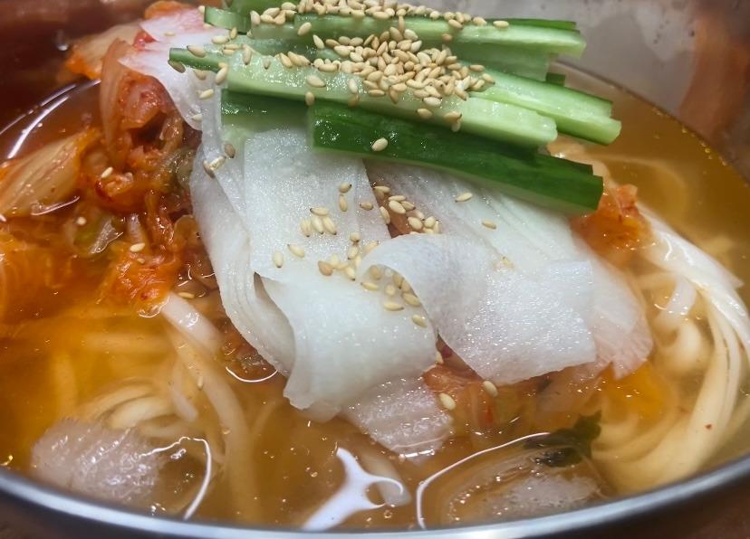 메뉴가 정해지면 그다음은 진행은 수월하다. 이미 머릿속에 레시피는 들어있기에, 손이 가는 대로 착착 진행한다. 냉면육수가 냉동상태라서 얼른 해동해야 했다. 배가 고파서, 냉동육수를 전자레인지 해동으로 어느 정도 녹여낸 후, 큰 얼음들을 쪼개면서 살얼음이 되게 준비했다. 소면을 삶으면 불기 전에 바로 국수를 말아먹어야 하니 고명들을 미리 준비한다. 계란을 위에 하나쯤 얹어줘야 비주얼적으로 예쁘고 단백질 섭취에도 도움이 되겠지만, 계란 하나 삶기는 너무 귀찮아서 생략한다. 냉장고 속 쌈무를 잘라 준 후, 냉장고 속에서 오이를 꺼내서는 손가락 길이로 토막 내고, 껍질 부분을 두껍게 돌려 깎기 해준 후 채 썰어 준비해 준다. 배추김치를 꺼내 참기름을 넣어 살짝 버무려주면 모든 고명이 준비됐다. 모든 게 준비되면, 이제 국수를 삶는다. 소면 삶기는 귀찮다. 물이 넘치지 않게 주의하며, 넘치려 할 때쯤 살짝 찬물을 뿌려줘야 하기 때문이다. 간혹 면을 삶으며 설거지를 한다거나 다른 것을 하나가 물이 넘쳐 피곤해졌던 적이 종종 있기에 이제는 소면 삶을 때는 면에 집중한다. 지금껏 소면을 몇십 번은 삶았겠지만, 아직도 정확히 몇 분 삶아야 익는지 모르겠다. 그냥 적당히 익은 것 같으면 면 몇 가닥 건져 먹어보고 판단한다. 면이 다 삶아지면 체에 밭쳐 물기를 빼내고, 찬물로 힘차게 조물 거리며 전분기를 빼줘 면을 탱탱하게 준비한다. 이제 그릇에 담아내면 끝이다.