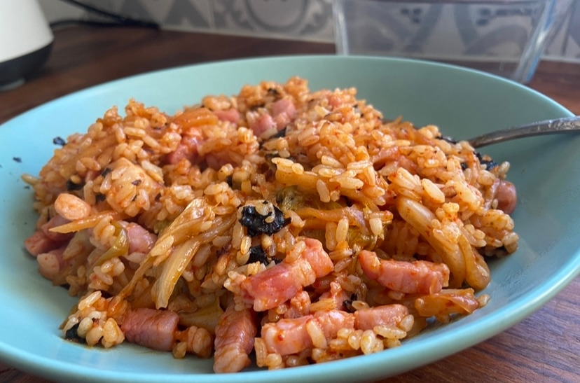 김치볶음밥은 간편하지만 언제 먹어도 맛있다. 마땅히 먹을 게 없는 날 볶음밥은 간단하면서 맛있게 먹기 좋은 메뉴이다. 이 날도 냉장고에 재료가 마땅치 않아 뭘 먹을까 하다가 김치가 보여 찬밥을 이용하여 김치볶음밥을 하기로 한다. 먼저 팬에 기름을 두르고, 김치를 넣어 볶아내 준다. 만약 베이컨 같은 것을 넣는다면, 기름에 베이컨을 먼저 익히며 베이컨 기름이 나오게 하고, 거기에 김치를 볶아주면 더 맛있다. Lardon(프랑스 베이컨) 한 팩을 듬뿍 넣어 김치볶음밥을 만든다. 여기에 고추장을 약간 반스푼만 넣어도 마치 삼겹살을 먹은 후, 먹는 볶음밥 같이 맛이 더 진하게 올라온다. 약간의 김가루까지 첨가하여 맛있는 김치볶음밥이 준비되었다.