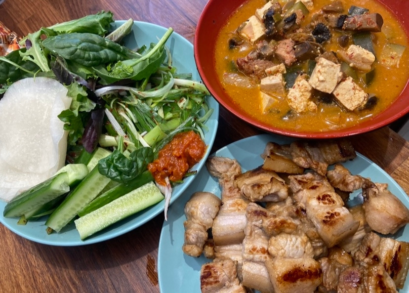 모든 요리가 끝났다. 고기도 옮겨 담고, 각종 채소들도 그릇에 담고, 된장찌개까지 그릇에 떠놓으니 그럴듯하게 삼겹살 정식이 완성되었다. 고기를 쌈장을 찍어 먹는다. 맛있다. 새콤달콤 우리 엄마 레시피 파절이와 곁들이니 느끼하지 않고 좋다. 쌈무에 파절이, 샐러드채소도 곁들어 고기와 함께 먹으니 건강해지는 기분이다. 가끔 된장찌개도 한 숟가락씩 떠먹으니- 만족스럽다.