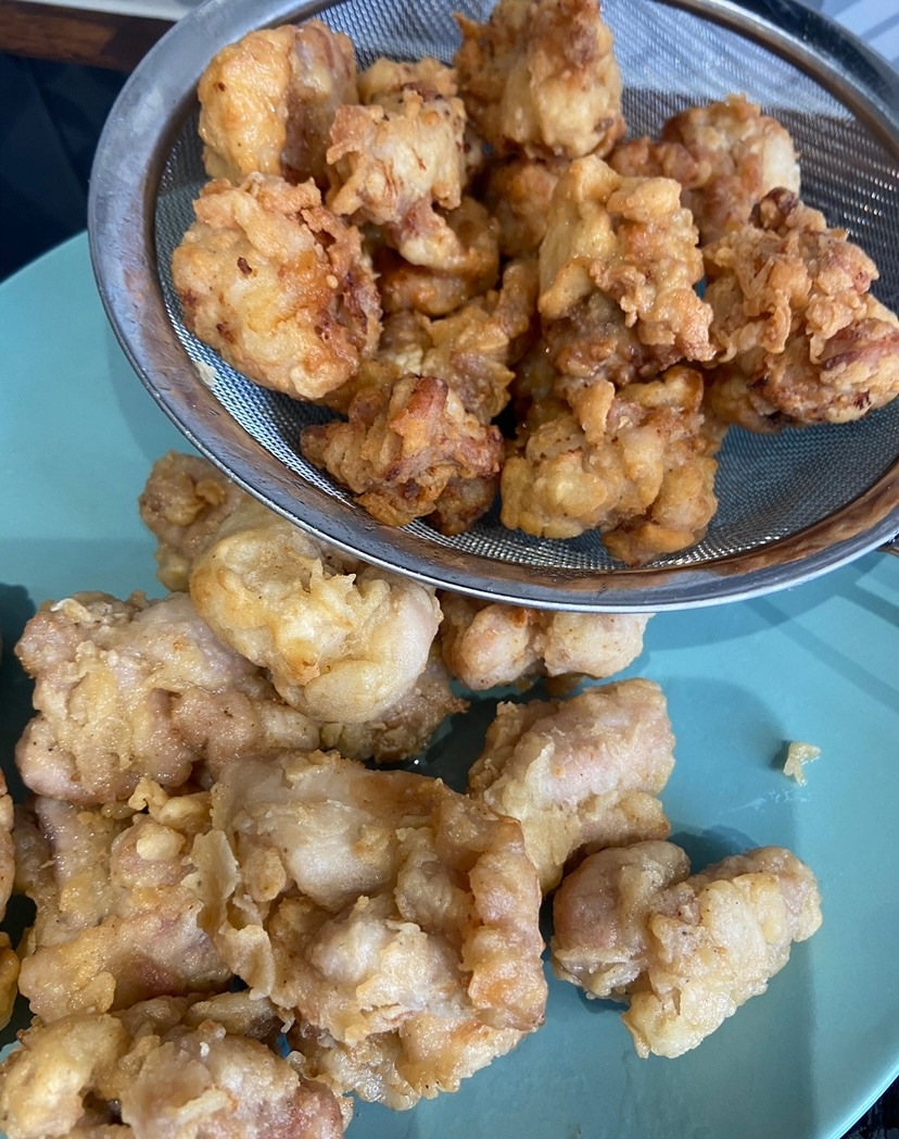 소스가 준비되었으니, 이제는 치킨을 튀길 시간이다. 먼저 닭다리살을 알맞은 크기, 즉 한입에 쏙 들어갈 적당한 크기로 잘라준다. 껍질은 벗기지 않았다. (취향에 따라 껍질을 놔두거나 벗기자). 닭고기에 간단하게 소금, 후추로 밑간을 해준다. 튀김가루에 마늘가루와 파프리카파우더를 살짝 섞어준다. 그런 후, 물을 부어 적당한 농도로 만들고는 먼저 잘라둔 닭고기를 넣어 반죽을 입혀준다. 그런 후, 다른 그릇에 준비된 마른 튀김가루에 젖은 반죽이 묻힌 닭고기를 넣어 마른 가루를 입혀준다. 모두 준비되었다. 이제 기름을 넉넉히 붓고 온도를 높인다. 처음 초벌은 낮은 온도에서 서서히 익혀 닭고기가 속까지 익게 만들 거다. 대략 섭씨 140도씨 정도면 될 거다. 그렇게 초벌로 튀겨진 닭은 꺼내보면 그다지 먹음직스럽지 않다. 초벌로 튀긴 닭을 체에 밭쳐 기름을 빼내고, 기름 온도를 올려 170도에서 두 번째로 튀겨준다. 이때 닭이 황금빛으로 튀겨지면서 주방에 서 치킨집 냄새가 나기 시작한다. 그렇게 모두 익은 치킨을 건져내고는 반은 간장마늘 소스에, 반은 매콤한 양념치킨 소스에 넣어 버무려주고 완성한다.