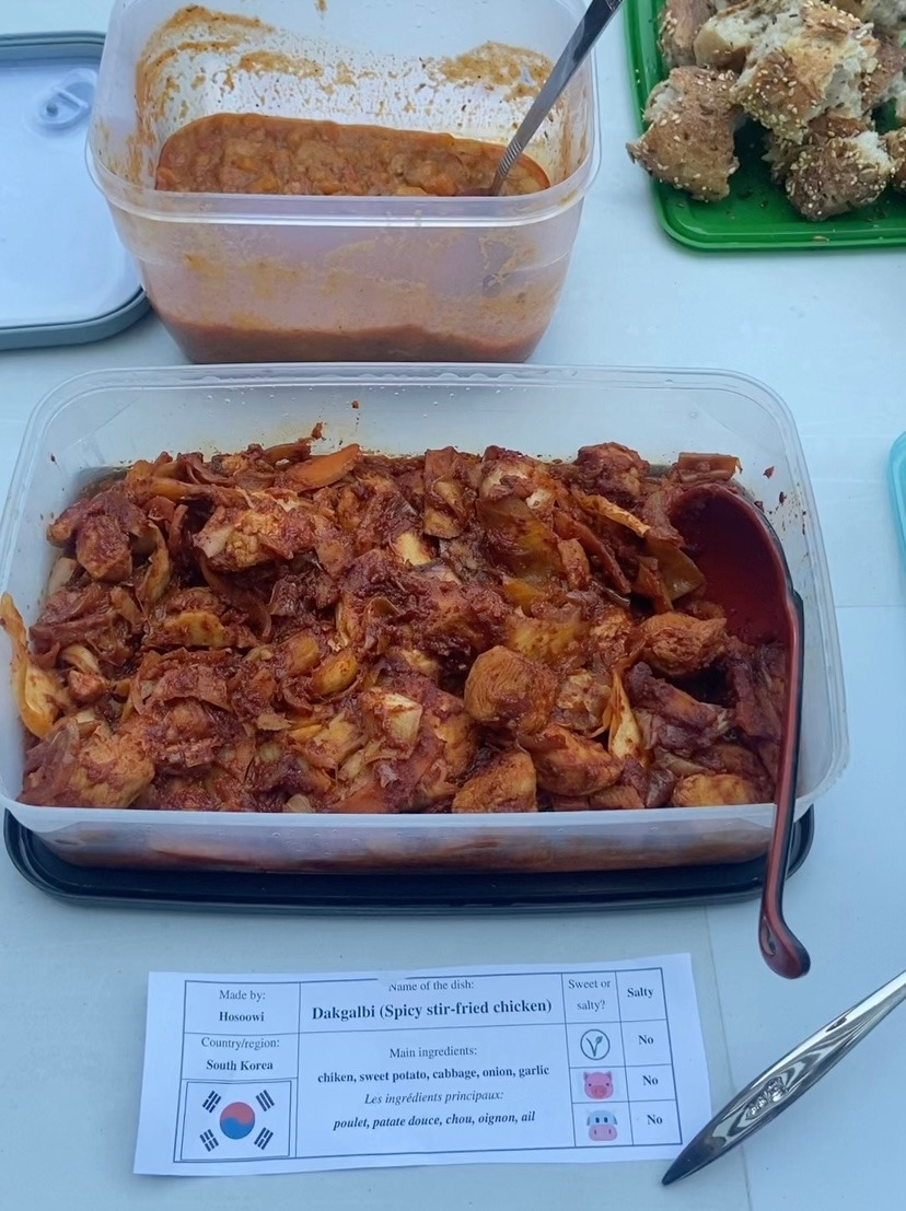포트럭 전날 마트에서 순살 (이번에도 편하게 순살)로 닭 안심을 구했다. 닭고기를 사 와서 미리 양념에 재워두었다. 양파를 갈아서 넣고, 고춧가루, 간장, 설탕, 다진 마늘, 그리고 중요한 치트키 카레가루를 넣고 밤새 재워두었다. 당일 아침에 함께 넣을 채소들도 준비했다. 양배추, 양파, 쪽파, 당금. 조금 늦게 일어나 서둘러 조리해야 했다. 겨우겨우 시간 내에 끝내고 통에 담아서 출근을 했다. 점심시간에 맞춰 인터내셔널 런치가 있는 테라스로 갔다. 테이블들이 길게 세팅되어 있었다. 자기 요리에 대한 설명이 인쇄된 종이를 가져다가 붙여두고 내 요리를 테이블에 두었다. 전년보다 더 다채롭고 다양한 요리들이 많았다. 내 요리가 약간 앞쪽에 있었는데, 거의 모든 사람들이 요리를 맛보는 것 같았다. 몇 번이나 떠가며 내게 한국 요리에 대해 칭찬하고 내 요리가 맛있었다는 칭찬을 받으면서 한식에 대한 자부심을 다시금 느낄 수 있었다.