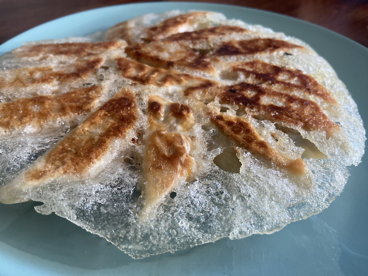 며칠 전 퇴근 후 집에 돌아왔다. 저녁을 먹기 위해 냉장고를 살핀다. 이것저것 요리할 재료들이 있지만 귀찮았다. 날도 덥고, 뭔가 하고 싶지 않지만 집 근처에 아무것도 없기 때문에 결국 내 저녁은 내가 해 먹는 수밖에 없다. 그때 냉동고 속 냉동만두가 생각났다. 아시아마켓에서 사다둔 김치만두였다. 프라이팬에 기름을 넉넉히 두르고 냉동 김치만두를 팬 위에 잘 정렬시킨다. 불을 켜고는 온도가 올라가며 지글지글 해질 때쯤, 준비한 전분물을 촤악하고 프라이팬에 뿌려준다. 만두가 없는 부분들에 전분물이 뿌려지면, 나중에 그 부분들이 바삭하게 익혀져서 별미가 된다. 전분물을 부은 후 프라이팬에 뚜껑을 덮어준다. 프라이팬에 맞는 뚜껑이 없다면 알루미늄 포일을 덮어주어도 좋다. 수분이 조금씩 날아가면서, 바닥이 바삭하게 익혀져 간다. 이때 너무 높은 온도로 하여 만두 바닥이 타지 않게 주의하자. 잘 익는지 모르겠으면 바닥 부분을 살짝 들어 올려 색을 확인하자. 그렇게 전분물의 물이 증발하면서, 만두의 위면은 촉촉하게 쪄지고, 바닥은 바삭하게 구워진다. 10분 내로 완성되는 간단한 한 끼이다.