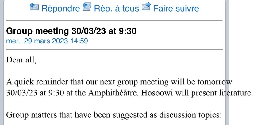 프랑스의 이 연구실에 온 후 그룹미팅 일정에 대해 설명을 들었다. 매주 목요일 아침 9시 반부터 진행되며 하루에 두 명씩 발표를 한다고 했다. 여러 사람들이 돌아가며 하다 보니, 다음 자기 순서는 최소 3개월 후에나 있었다. 그동안 학생들은 실험을 하며 데이터를 쌓아가고 연구를 진행한다. 이곳에서 학생들은 상당히 열의에 차있고, 연구에 동기부여가 많이 되어 있었다. 그룹미팅마다 발표하는 학생 한 명 한 명 발표의 질이 좋았다. 데이터의 나열이라기보다, 자기 연구에 대한 이해가 확고한 게 보였다. 잦은 발표가 아니라, 최소 3개월에 한 번 있다 보니 모두 자기의 발표 준비에 최선을 다하고 제법 많은 시간을 소요하여 철저히 준비하는 편이었다. 그룹 미팅에서 발표하는 사람도 최선을 다하는가 하면, 발표를 듣는 다른 학생, 포닥, 정규직 연구원들 모두 집중해서 듣고 다양한 질문들을 한다. 가끔은 발표 후 질의응답으로 1시간이 소요될 때도 있었다. 그렇게 두 명이 발표를 하고, 질의응답을 하다 보니 세 시간 가까이 진행되는 경우가 있었고 불만의 목소리가 있었다고 하더라. 그룹미팅이 너무 오래 진행되어 당일 아침에 다른 업무나 실험을 할 수 없다는 거였다. (이곳 사람들은 요구하는 게 참 많다.) 그래서 매주 두 명 발표에서 한 명 발표로 변경되었다. 게다가 한동안 안 하던 Literature 발표도 진행하기 시작했다. 그동안은 자기 research만 발표했었는데, 사람들이 순서대로 Literature, research를 번갈아 가며 발표하다 보니 한 번 발표하면 그다음 발표까지 6개월 이상이 걸리게 되었다. 하지만 교수가 한 달이나 두 달에 한 번 정도는 개별 미팅을 진행하면서 중간중간 연구 진행 상태를 확인하고는 했다. 어떤 학생들은 충분한 관심을 받지 못한다고 생각하며 연구실의 시스템에 불만을 갖기도 했다.