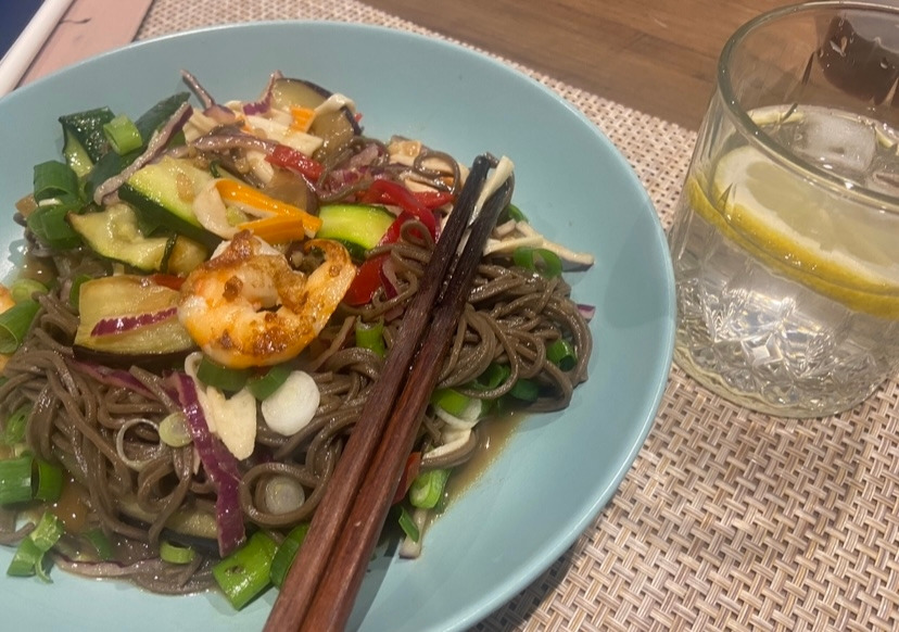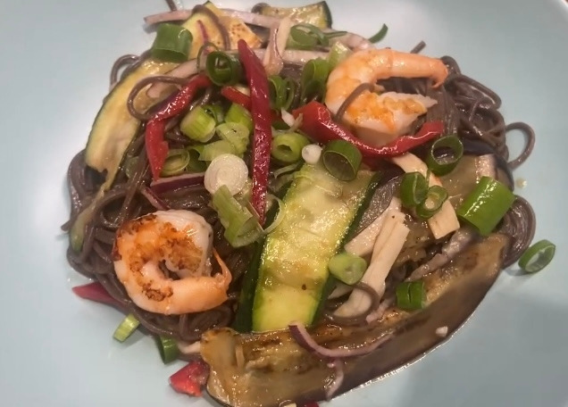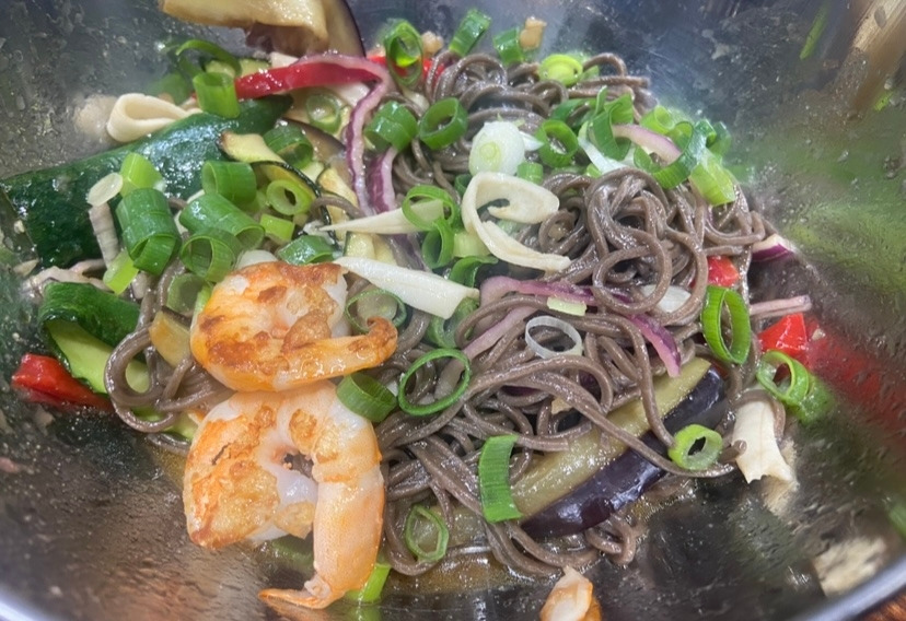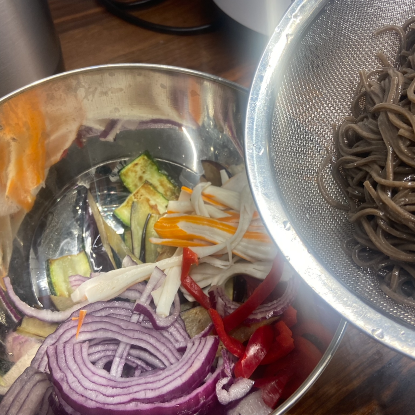 모든 재료들을 한 데 넣고 휘저어서 섞어준다. 소스는 완성이다. 미리 국수를 삶으면 불어버릴 수 있으니, 먼저 채소들을 굽기 시작한다. 양파를 채 썰어 준비하고, 파프리카도 알맞게 썰어준다. 단백질 흉내를 내줄 맛살도 적당하게 찢어서 준비해 준다. 가지와 쥬키니를 모두 칼로 얇게 저며 준비해 준 후 소금만 살짝 뿌리고, 기름 둘른 팬에서 앞 뒤 구워내 준다. 냉동실에서 꺼낸 새우의 껍질은 까고, 등에 칼집 넣고 내장인지 똥인지를 제거해 준 후, 채소를 구웠던 팬에 구워준다. 새우를 구워주면서 옆에서 냄비에 물을 끓인다. 물이 끓으면 메밀면을 넣고는 봉투에 적힌 시간만큼 면을 삶아주고 체에 밭쳐 물기를 빼내며 살짝 물에 헹궈내 준다. 이제 모든 면, 준비한 각종 재료들을 볼에 담고 미리 만들어 둔 소스를 넣고 한 껏 버무려준다. 15분이면 간단하게 완성할 수 있다.