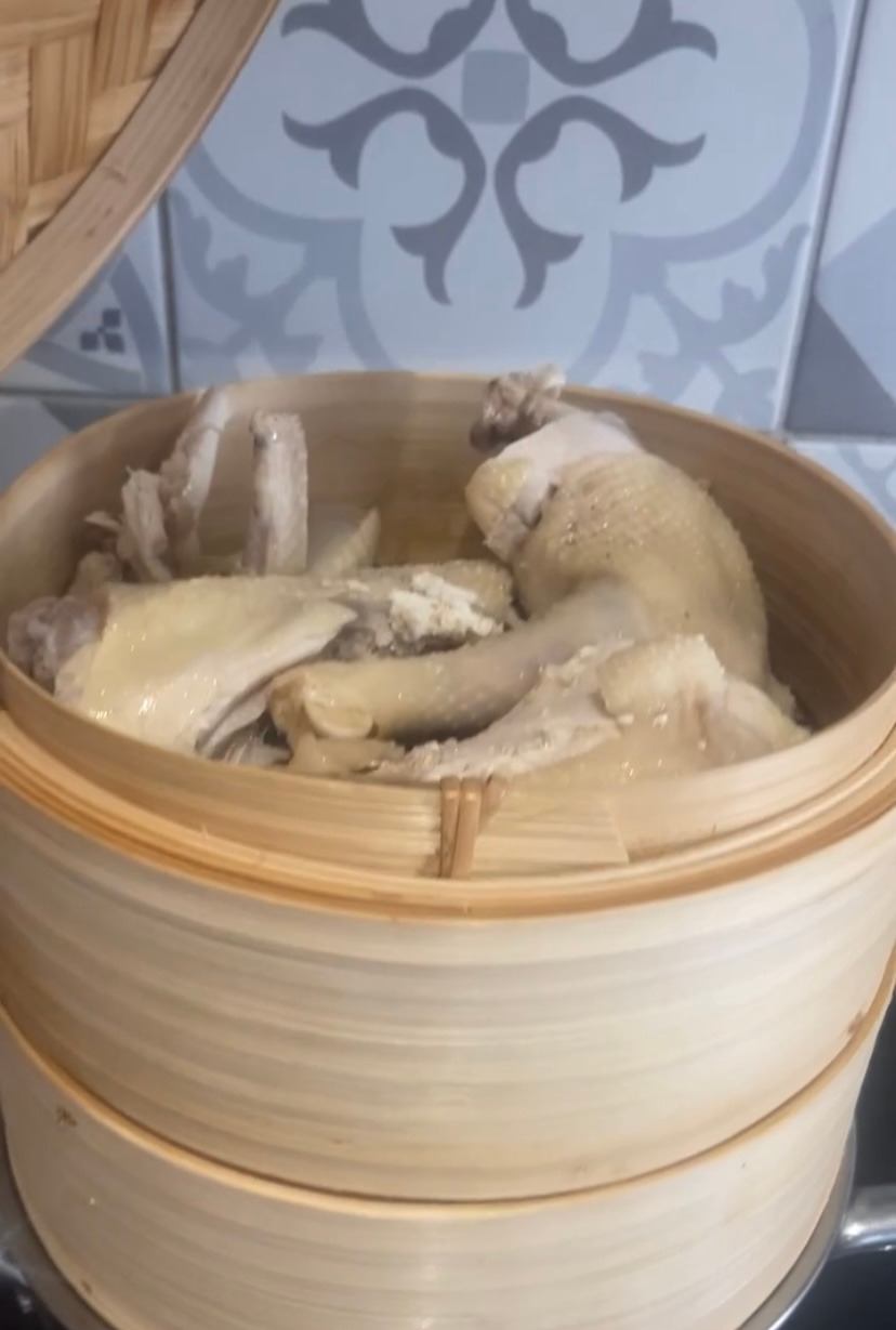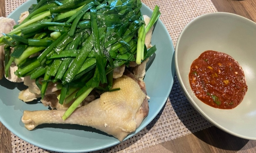 그렇게 닭이 쪄지는 동안 양념장을 준비해 보았다. 먼저 고춧가루에 닭 육수를 넣어 고춧가루를 불려준 후, 간장으로 간을 하고, 여기에 겨자와 설탕, 식초, 다진 마늘, 다진파를 넣어 함께 섞어내 주었다. 그런 후 맛을 보았는데, 와우- 소스가 너무 맛있었다. 나는 한국식 겨자는 이곳에서 구하지 못해서, 프랑스라 디종 머스터드를 넣었다. 아무래도 한국 겨자모다는 매운맛이 약하고 좀 더 부드러운 이 디종머스터드의 맛이 더 내 취향에 맞아 소스를 맛있게 만들어 준 것 같다. 닭은 어차피 푹 삶아내어 찌는 게 사실 무슨 의미가 있을까 싶기는 했다. 그래서 어느 정도 찌는 흉내만 내준 후, 마무리했다. 닭 육수에 사 온 부추를 한번 데쳐내 준다. 그릇에 찜기에서 꺼낸 닭을 모두 담고, 그 위에 부추를 얹는다. 그런 후 소스를 곁들여 한 상 차려본다.