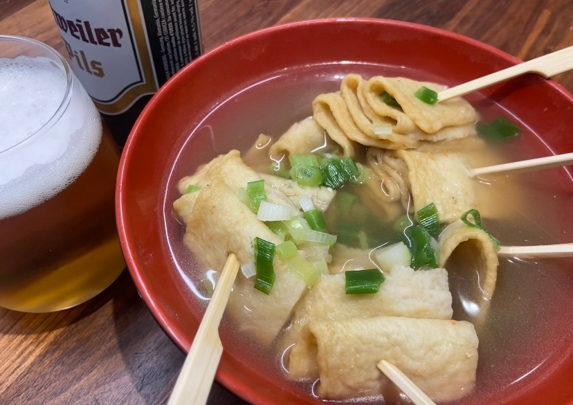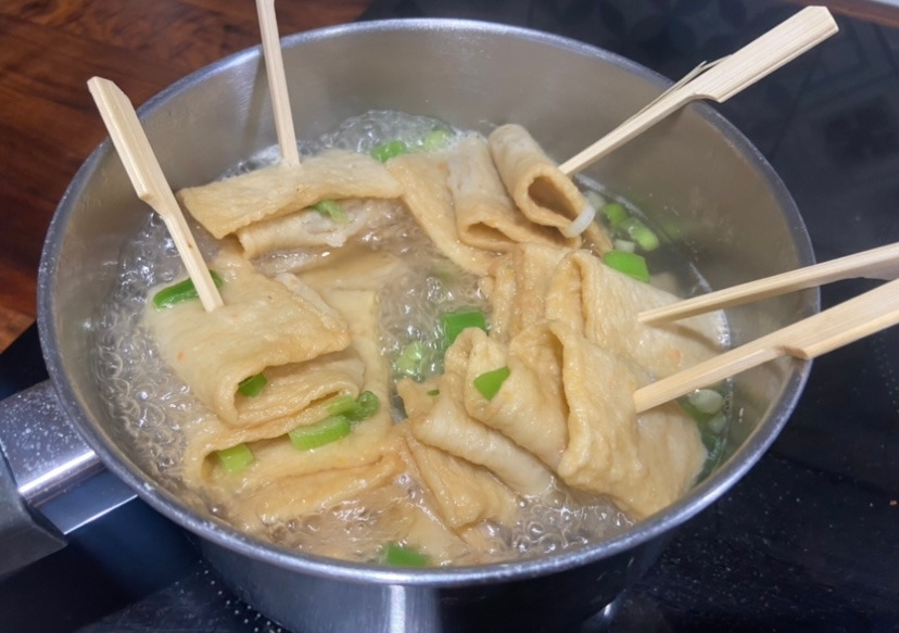 사다 뒀던 맥주를 얼른 냉동실에 넣어두고 오뎅탕을 위한 육수를 먼저 준비하기 시작한다. 멸치와 다시마, 물을 함께 냄비에 넣고는 끓이기 시작한다. 팔팔 끓기 시작하면 다시마를 건져내 주고, 멸치만으로 20분가량 충분히 끓여 육수를 뽑아낸다. 육수가 끓는 동안, 얼마 전 필요해서 구매 후 잔뜩 남아 구석에 박아뒀던 나무 꼬치를 꺼내든다. 아시아마켓에서 사다 두는 오뎅을 보통 냉동실에 얼려서 보관하는데 (양이 많아서) 얼른 해동해서 꼬치에 끼우려는 생각에 전자레인지로 대충 해동 후 꼬치에 끼우려 구부리니 많이 부서지기 시작했다. 사실 더 기다렸다가 하면 되는데, 야식으로 얼른 맥주에 곁들여 먹을 생각에 맘이 급해 마구잡이로 꼬치에 꽂아서 예쁘지 않게 완성됐다. 괜찮다. 이것은 손님 접대가 아닌, 나 혼자 먹기 위한 요리니까 말이다. 육수가 다 끓으면 멸치를 건져내고는 준비해 뒀던 오뎅꼬치를 넣는다. 냄비가 깊지 않아 꼬치를 세우니 오뎅이 모두 잠기지 않았다. 젓가락으로 손잡이 부분까지 모두 잠기게 꾹꾹 눌러서 모두 익게 했다. 오뎅은 어차피 튀겨서 다 익은 상태니까 어느 정도 부드러워지게 살짝만 익혀줘도 끝이다. 간은 국간장과 액젓을 함께 이용한다. 국간장을 너무 많이 넣으면 색이 지나치게 검어질 수 있으니, 간이 부족하다면 추가는 소금을 이용하는 게 좋다. 오뎅이 익는 동안 재빠르게 파를 썰어준 후, 듬뿍 뿌려 마무리한다.