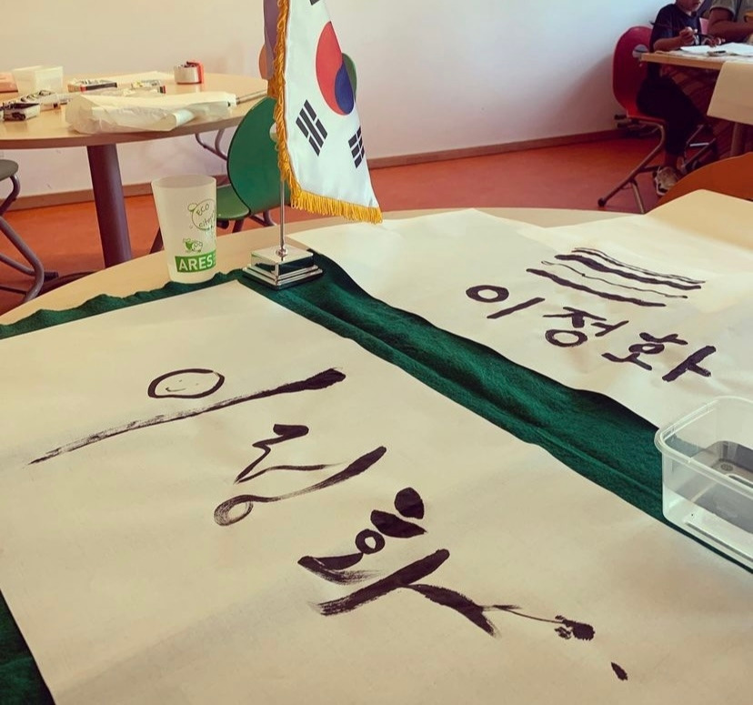 다행히 시간 맞게 도착했다. 아직 서예 클래스가 진행 중이었다. 나이대가 다양했다. 서예가 분은 생각 보니 젊은 여자분이셨고, 그분의 동생인 것 같은 (아마도 매니저 역할을 하는 듯했다.) 분도 함께였다. 두 분 다 불어를 못 하셔서 교장선생님이 통역을 해주며 클래스를 진행하는 것 같았다. 내가 도착했을 때 참가자들이 글쓰기를 끝내고, 마지막으로 서예가 분이 글씨 하나를 쓰기 시작하셨다. 보고 싶었지만, 나는 이 분들이 모두 끝나기 전에 한쪽 자리에 다과를 차려야 했다. 구비된 큰 접시들을 잘 정렬해 놓고 가져온 요리들을 하나하나 꺼내 담기 시작했다. 미니상추 위에 미니주먹밥을 올리고 그 위에 참치쌈장을 조금씩 놓았다. 두 번째 접시에는 미니 떡갈비를 하나씩 두고 떡갈비에 이쑤시개를 꽂아주었다. 그다음은 김밥을 하나씩 정렬해 두고 김밥에도 이쑤시개를 꽂아 준비해 두었다. 마지막으로는 가져온 떡꼬치에 양념을 발라서 그릇에 잘 정렬해 뒀다. 준비가 금방 끝났다. 마침 서예가 분이 글씨를 다 쓰셨다. 나도 구경했다. 꿈이라는 글자를 예쁘게 쓴 거였다. 꿈이란 단어에 대해 설명하고 오늘 이 시간이 너무 즐거웠다며 여러분과 다음에는 한국에서 다시 만나기를 꿈꾼다며 인사를 하셨다. 모두 함께 박수를 쳤다.