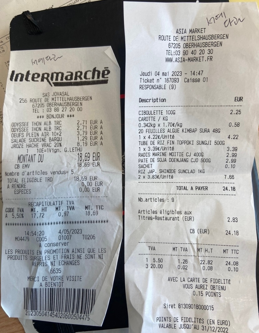 서예 아뜰리에는 오후 4시에 시작한다고 했고, 끝나는 시간인 6시에 맞춰 다과를 준비하면 된다고 했다. 나는 약 4시에 퇴근해서 1시간 안에 모든 요리를 마치고, 6시까지 이동할 계획을 세웠다. 전날 미리 장을 봐서 준비할 수 있는 것은 미리 준비를 해둘 생각이기에 미리 계획들을 세웠다. 장 볼 리스트를 미리 작성한다. 떡 2팩, 쌀 2 kg, "쪽파 하나, 된장, 당근, 단무지, 김, 미니상추, 참치 2캔, 소고기 다짐육 500 g, 계란. 장을 보니 대략 43유로가 나왔다. 별로 많이 산 것 같지 않은데 돈이 은근히 나왔다. 그다음은 해야 할 것들을 순서대로 작성해 본다. 전날 참치 쌈장은 미리 만들어 냉장고에 넣어둔다. 밥도 미리 해서 보관해 둔다. 소고기 다짐육도 밑간 해서 동그랗게 모양을 만들어 냉장고에 넣는다. 떡꼬치를 위한 떡을 잘라 미리 꼬치에 끼워두고 양념소스도 미리 만들어둔다. 전날 계획대로 모든 걸 마무리해 둔다. 머릿속으로 다음날 해야 할 일을 다시 한번 정리해 본다. 문제없이 다 잘 해낼 것 같다.