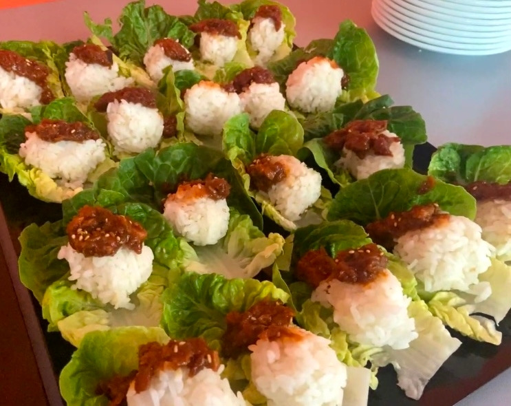 경험해 보니 외국인들이 쌈장을 좋아하더라. 미니 상추 위에 동그랗게 미니 주먹밥을 만들어 올리고 그 위체 참치 쌈장을 얹어준다.