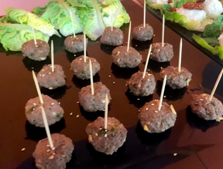 단백질 메뉴료 미니 떡갈비를 만들어 하나씩 가져가기 쉽게 꼬치를 꽂아준다.