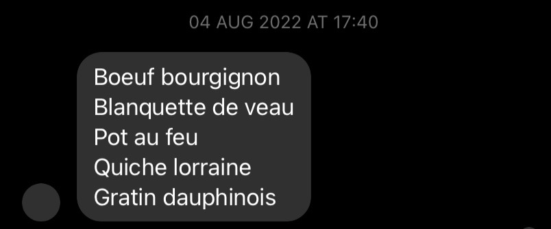 프랑스 식재료들이니 프랑스 요리를 해 먹을 거라 생각할 수도 있다. 나도 그러려고 했고 내가 그럴 줄 알았다. 그런데 프랑스 음식이 뭔지 도대체 알 수가 없더라. 연구소의 식당에서 점심을 해결하곤 하는데, 메뉴들을 보면 특별히 이게 프랑스 요리인가 싶은 게 별로 없다. 한국으로 치자면 소고기찜 정도 될 뷔프부르기뇽, 식사용 타르트인 퀴시, 잠봉과 치즈를 넣어 튀긴 치킨 코르동 블루, 애니메이션으로 유명한 라따뚜이 이 정도 말고는 어니언 수프, 달팽이, 한국의 육회 같은 스테이크 타르타르 정도가 생각난다. 프렌치 음식이 유명한 건 아무래도 가정식보다는 값비싼 파인 다이닝 요리가 아닌가 하는 생각이 든다. 안타깝게도 나는 파인 다이닝에 다닐 여유가 없다. 연구실의 프랑스인 동료들에게 "너는 집에서 뭐 해 먹어?"라고 물어봤던 적이 있다. "파스타나 샌드위치나 쿠스쿠스나..." 내가 생각한 프랑스 요리가 아니다. 이 친구에게 집에서 프랑스 요리를 하나씩이라도 해보려고 한다고 뭘 하면 좋을지 알려달라고 해서 리스트를 받았다. 이 친구가 생각해도 별로 몇 개 없나 보다. 5개 정도를 적어서 메시지를 보내줬다.