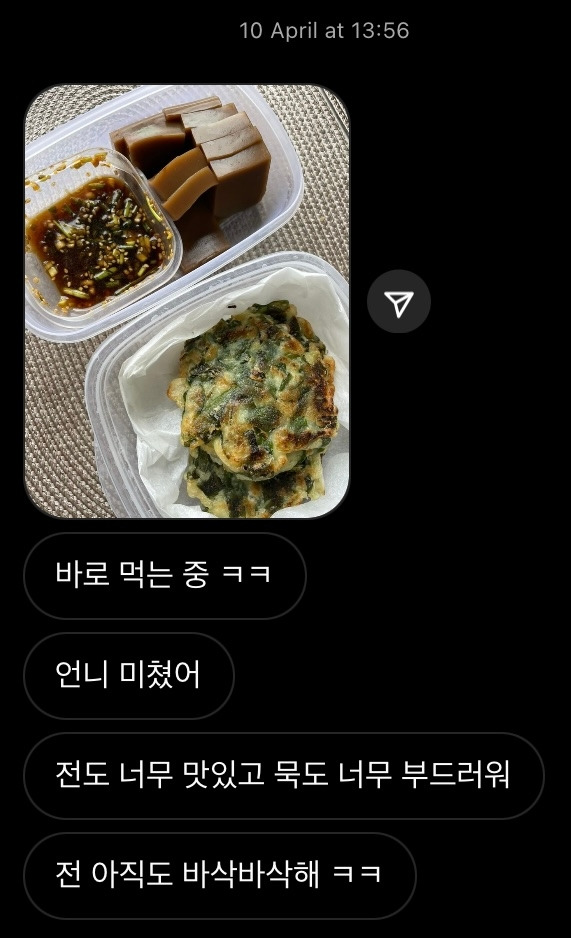 처음 맛보는 명이나물 전을 젓가락으로 잘라 한 입 먹어본다. 우왓 맛있다! 나도 모르게 튀어나온 말이다. 식감은 부추전과 비슷한데 부추전보다는 더 향이 강했다. 기분 좋은 향으로 말이다. 뿐만 아니라 내가 만들었지만 반죽의 농도가 기가 막히게 적당했었는지 바삭함이 최고였다. 게다가 선물로 받은 도토리묵도 한국에서 직접 수집한 도토리로 가루 내어 만든 거라더니 도토리에서 내가 싫어하는 쌉싸름한 맛이 없이 깔끔하게 도토리만의 향은 풍부하면서 아주 탱글탱글한 게 너무 맛있었다. 이렇게 맛있는 것을 혼자 먹는다는 게 너무 아까워서 주변에 누군가에게 나눠주고 싶었다. 아끼는 동생이 생각나 바로 연락한다. 명이나물 전 큰 한 판을 혼자 다 먹어치워서 가져다주기 위해 명이나물 전을 다시 만든다. 도토리묵도 함께 도시락통에 담아 동생네 집으로 간다. 건네주며 서로 근황에 대한 대화를 좀 하다가 헤어지고 집에 돌아온다. 얼마 지나지 않아 동생에게서 메시지가 온다. 미친 맛이라고 했다. 이 친구가 이렇게 격하게 반응해 준 건 처음이다. 명이나물전이 그만큼 맛있다는 거다.