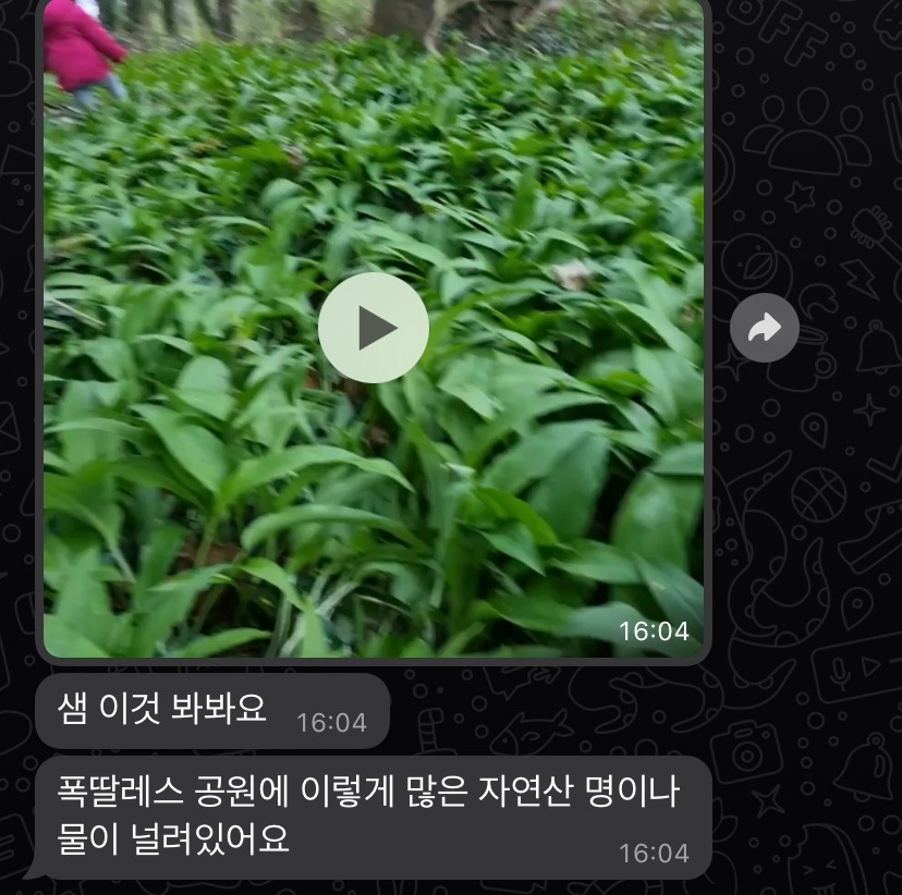 날이 좋던 어느 봄날, 평소처럼 연구실에서 일을 하고 있었는데, 그 학부모로부터 메시지가 왔다. 명이나물을 좋아하냐는 질문이었다. 뜬금없었다. 태어나서 명이나물을 좋아하냐는 질문을 받아본 적이 없다. 그런데 그런 질문을 프랑스에서 받으니 이게 대체 무슨 질문인가 싶었다. 그러면서 명이나물 밭의 사진과 명이나물을 한 움큼 손에 들고 있는 인증사진을 보내주셨다. 숲에 자연산 명이나물이 널려있다고 했다. 주말 시장에서 1kg 당 15유로에 파는데 숲에 가서 그냥 뜯으면 된다면서 혹시 좋아하면 같이 가자고 했다. 지금까지 간장에 절여진 명이나물 외에 자연산 명이나물을 본 적이 없어 너무 신기했던 나는 함께 하기로 했다.