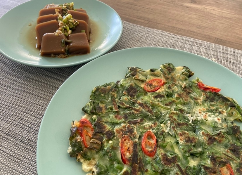 담을 수 있는 통에 최대한 담았는데도 명이 나물이 남았다. 명이나물을 잔뜩 수확했던 학부모님의 말에 따르면 명이 나물로 전을 해도 맛있다고 했다. 명이나물 전이라니 태어나서 처음 들어봤다. 애초에 신선한 명이나물 자체를 구해본 적이 없으니 명이나물 전을 내가 해봤을 리가 없다. 또한 한국에서도 명이나물이 저렴하지 않으니 식당에서 전을 팔지도 않는 게 어쩌면 당연했다. 전을 만드는 건 간단했다. 부추전이나 파전이랑 비슷하면 되지 않겠는가. 부침가루를 꺼내 물을 넣어 적당한 농도로 만들어 준다. 명이나물을 하나를 그대로 넣기에는 조금 큰 듯하여 적당한 크기로 잘라서 반죽과 섞어주었다. 팬에 기름을 넉넉히 둘러주고는 반죽을 넣고 구워준다. 마침 냉장고에 홍고추가 있기에 잘라서 몇 개 얹어주니 색도 나고 보기 좋다. 바삭하게 구워낸 명이나물 전과 지인에게 명이나물을 주고받은 도토리묵을 곁들여서 상을 차린다. 마치 등산 후 먹방과 같은 자연적인 식탁이 맛있어 보인다.
