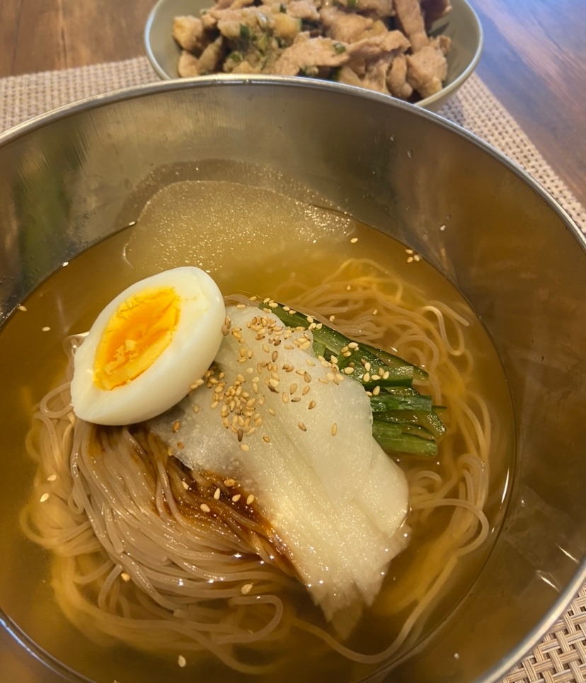 냉면 육수가 있다고 물냉면만 먹겠는가. 나는 비빔물냉면을 좋아한다. 물냉면에 비빔양념장까지 넣는 것이다. 거기에 겨자에 식초까지 넣어 아주 자극적으로 먹는다. 비빔장도 만들어 냉장고에 넣어두고 먹고 싶을 때마다 먹는다. 냉면을 먹으니 고기와 냉면을 함께 먹고 싶어 불고기를 만들어 곁들기도 하고 돼지고기를 양념해서 함께 먹기도 한다. 내가 냉면을 SNS에 업로드하자 한국인 유학생 동생이 냉면이 먹고 싶다고 했다. 그 친구를 초대해서 불고기와 냉면을 맛 보였다. 지난번에는 짜장면을 양념까지 모두 먹고 가더니 이번엔 냉면도 남김없이 해치우고 돌아갔다. 혼자 먹어도 맛있지만 역시 함께 먹는 게 더 좋다.