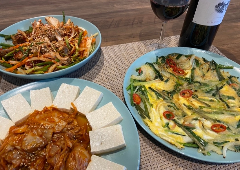 골뱅이 무침을 먼저 만든다. 채소들이 충분치는 않지만 냉장고 속 재료들로 최대한 준비해 본다. 골뱅이 캔의 국물을 전부 버리진 않는데 약간의 비린맛이 있을지 몰라도 국물의 감칠맛이 양념에 가치를 더해준다. 내 양념은 간단하다. 간장, 고춧가루, 고추장, 설탕, 식초, 그리고 골뱅이 국물과 후추가 전부이다. 적당히 먹기 좋은 크기로 자른 골뱅이와 갖은 채소들을 넣고 한데 버무려준다. 그다음은 두부를 잘라 따뜻하게 데워주고 볶음김치를 곁들여 그릇에 담아둔다. 파전도 잊지 않는다. 바삭하게 먹어야 하니 파전을 제일 마지막에 만든다. 마지막으로 와인과 와인잔을 챙긴다.