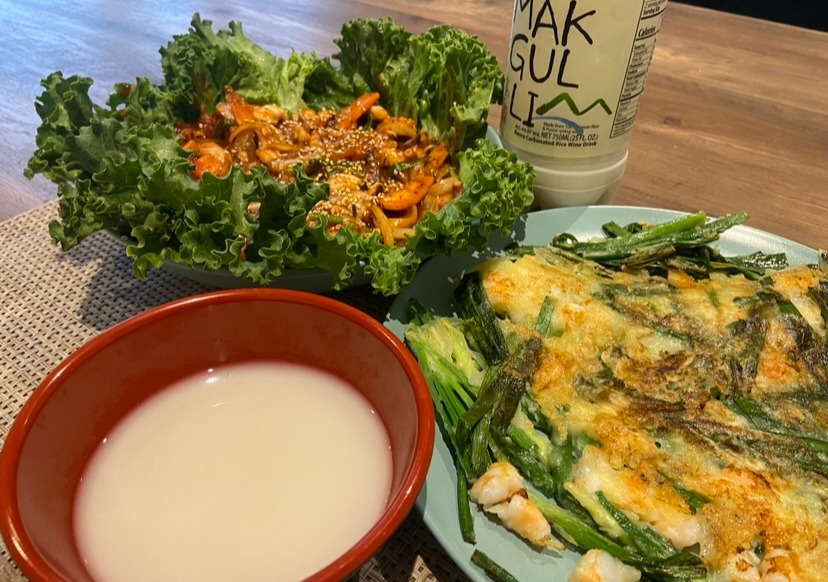 장을 보고는 집에 와서 냉장고에 막걸리를 얼른 넣어두고 잠시 쉰다. 즐거운 혼술 타임을 위해서는 에너지를 좀 충전해야 한다. 잠시 쉬고는 나를 위한 저녁 술상을 차리기 시작한다. 쉬는 동안 해동된 낙지를 이용해 양념을 넣고는 낙지볶음을 만든다. 나는 낙지볶음에 미나리를 넣는 것을 좋아한다. 어릴 적부터 집에서 엄마가 미나리를 넣고 해 주셔서 그 맛에 익숙하기 때문이다. 하지만 이곳에서는 미나리는 도저히 구할 수가 없어서 내가 좋아하는 우리 엄마표 낙지볶음은 할 수가 없다. 오늘은 그냥 내 맘대로 낙지볶음이다. 막걸리가 시원해지는 동안 파전도 얼른 만들어본다. 해물 파전을 하고 싶지만, 해산물이 냉동실 새우뿐이다. 새우라도 넣어 새우 파전을 완성한다. 시원해진 막걸리를 그릇에 담는다. 컵이 아닌 그릇에 담아야 막걸리 감성이다. 낙지볶음을 맛본다. 낙지가 쫄깃함이 조금 부족하지만 냉동이니 어쩔 수 없다고 이해하고 넘어간다. 양념은 내가 했지만 훌륭하다. 엄마의 낙지볶음처럼 미나리까지 넣었다면 훨씬 훌륭했을 텐데 아쉽다.
