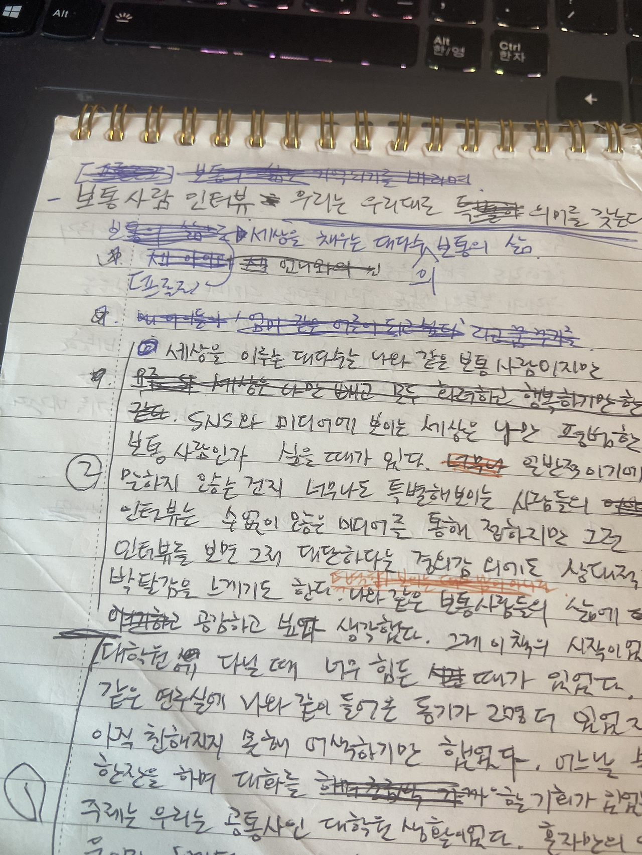 목차를 쓰는 것도 너무 수월했다. 질문하고 싶은 사람들이 속속 생각나서, 그들에게 연락을 했다. 제일 먼저 생각한 건 언니와 내 제일 친한 친구이다. 내가 알고 있는 그들의 삶을 기반으로 내가 궁금한 것들을 물었다. 마지막에는 공통된 삶의 목표에 대한 질문을 했다. 원래는 예상 질문지를 주고 줌이나 카카오톡 전화를 통해 진행할 생각이었는데, 둘이 모두 재빠르게 질문지에 답변을 모두 작성해서 보내줬더라. 그들 덕분에 다른 사람들을 설득하기가 훨씬 수월했다. 다른 사람들에게도 연락한다. 내 책의 콘셉트를 설명하니 모두 좋다고 한다. 거기에 이미 받은 두 명의 초안을 보여주자 모두 내용이 좋다며 흔쾌히 하겠다고 했다. 재밌겠다고 하는 사람들도 많았다. 그렇게 지금까지 확정된 인원만 7명이 된다. 7명에게는 개개인에게 맞춰 질문들을 작성해서 보냈다.