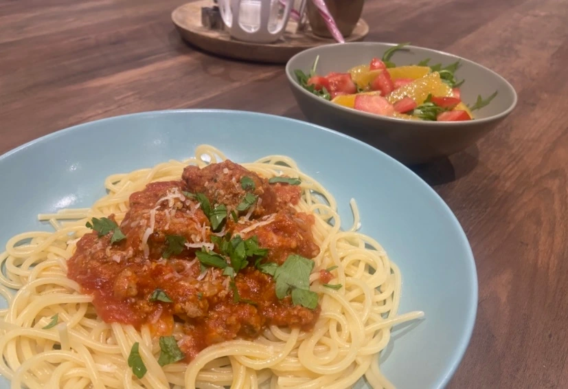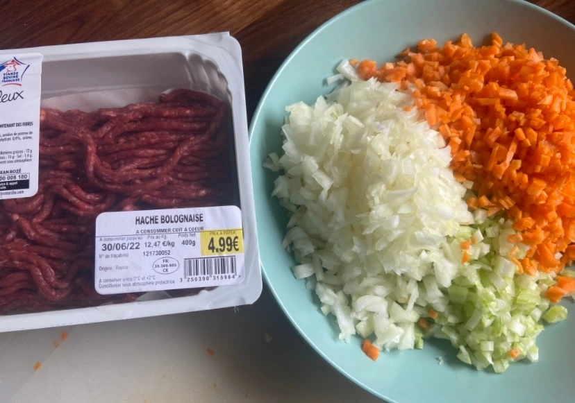 프랑스에 와서도 파스타가 먹고 싶어 장을 봤다. 토마토 캔과 토마토페이스트를 다 사려고 보니 옆에 다 만들어진 시판 토마토소스가 더 싸더라. (한국에서도 파스타용 토마토소스가 세일을 꽤나 자주 하지 않는가.) 그래서 이미 만들어진 소스니 맛은 있을 것이고, 여기에 고기와 다른 재료만 넣으면라고 소스를 더 저렴하게 만들 수 있을 것 같았다. 그렇게 기본 토마토소스와 소고기다짐육을 사서 집에 돌아온다. 셀러리가 소량 포장되어 파는 걸 발견하여 냉큼 가져온다. 평소에는 셀러리가 한 단으로 팔아서 생략하곤 했다. (하지만 셀러리까지 들어가야 당연 더 맛있다! 하지만 당근과 양파가 필수라면 셀러리는 필수까지는 아니니 생략해도 맛은 좋다.)