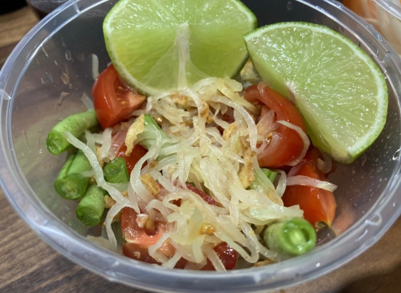 이번 레시피는 쏨땀이라고 부르기엔 내 나름의 재료들이 들어가기에, 쏨땀을 재해석한 나만의 파파야샐러드라고 부르는 게 맞을 것 같다. 이런 나의 파파야 샐러드는 먼저 사온 냉동 파파야를 해동하는데서 시작된다. 물에 담가 빠르게 해동시켜 준다. 한번 맛을 보니 아삭한 듯 약간 꼬들한 식감이 생생하다. 한국에서 쏨땀을 시키면 사실상 숙주샐러드에 파파야를 넣은 정도로 파파야의 양이 많지 않다. 하지만 나는 파파야가 듬뿍 있기에 숙주 없이 파파야만 가지고 만들기 시작한다. 드레싱이라 해야 할지 소스라 해야 할지, 그 양념은 간단하다. 중요한 것은 라임즙과 피시소스이다. 라임즙을 두 개쯤 짜 넣고, 피시소스를 넣고 설탕을 넣어 맛의 밸런스를 내 입맛대로 맞춰준다. 원래 쏨땀은 고추도 넣고, 건새우도 넣어 감칠맛을 터트려주는 요리이다. 나는 건새우도 없으니 생략하고, 고추도 없기에 매콤함을 위해 한국의 고추장을 선택한다. 고추장을 살짝 넣어 매콤함을 더해준다. 더 맛있어졌다. 이렇게 준비된 양념에 토마토, 깍지콩, 채 썬 당근과 파파야를 버무려 준다. 마지막으로 취향껏 튀긴 양파를 뿌려주었다. 맛을 본다. 맛있다. 정말 맛있다. 굉장히 깔끔하게 감칠맛이 터진다. 마지막에 뿌려준 튀긴 양파가 신의 한 수였다. 언니에게 바로 맛 보여 주고 싶은데 나는 프랑스에 언니는 한국에 있었다. 아쉬웠다.