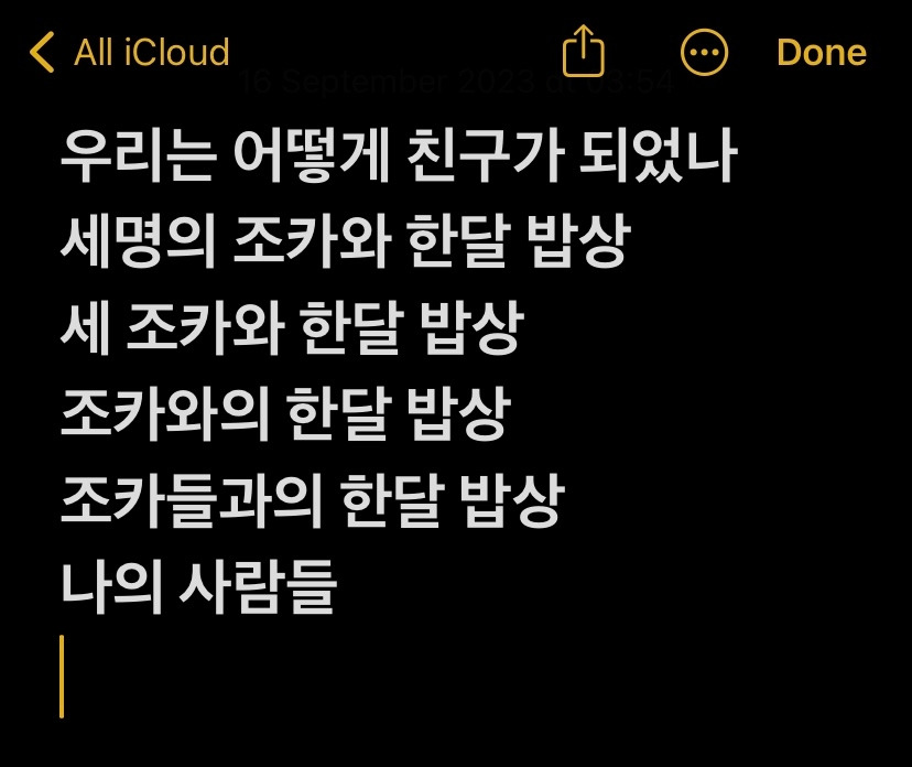 요즘 글 쓰기가 즐겁다. 그 어느 때보다 글 쓰는 행위자체에서 즐거움을 느끼고 있다. 어쩌면 조금 과한 것 같은 느낌도 든다. 퇴근 후에 저녁을 차려 먹은 후, 바로 노트북 앞에 앉는다. 그렇게 한 두 글을 써 내려가고는 브런치에 포스팅을 한다. 그러면 식곤증인지 피곤했던 하루 때문인지 침대를 찾아 눕게 된다. 그렇게 두 시간 정도 잠에 들고는 다시 눈을 뜬다. 새벽이 되었지만 잠은 오지 않는다. 약을 먹어야 잠을 푹 잘 수가 있어서, 일단 약을 먹는다. 약을 먹고는 다시 잠이 오길 기다리면서, 또다시 노트북 앞에 앉아 글을 쓰기 시작한다. 약 기운에 이제 다시 잠이 들려할 때쯤 머릿속에 또 다른 책 주제가 떠오른다. 재빠르게 핸드폰을 켜서는 메모장에 머릿속에 떠오른 책 제목을 적어본다. 오늘은 두 가지가 생각났다. 한 가지는 나와 친구가 된 사람들과의 이야기에 대한 "나의 사람들" 혹은 "우리는 어떻게 친구가 되었나"이다. 다른 하나는, 내가 프랑스에 오기 전 언니네 집에서 한 달여간 신세를 지면서, 조카들을 위해 차려주던 밥상에 대한 "조카와의 한 달 밥상"이다. 둘 다 머릿속에 구체적으로 어떤 내용이 들어갈지가 이미 쫘악 펼쳐진다. 얼른 써야겠다 생각하는데, 아직도 쓰고 있는 시리즈가 많다.