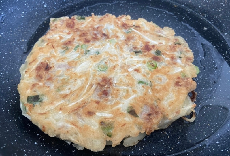 가쓰오부시가 살랑살랑 흔들리는 모습에 제법 그럴싸해 영상으로도 찍어본다. 먹음직스럽다. 조금 크지만 말이다. 반죽이 윗면은 바삭하게 구워지고 속은 촉촉하다. 잘라서 먹어보니 맛있다. 내 맘대로 했지만 간도 너무 좋고, 좋다. 오코노미야키 전문점이 아닌 곳에서 이걸 오코노미야키라고 판다면 누구라도 사 먹을 것 같다. (전문점은 당연히 더 높은 기준으로 평가해야 하므로) 일본인과 결혼한 언니에게 사진을 보낸다. 내가 만든 거냐며 대단하다고 한다. 오늘도 한 건 했다.