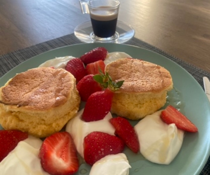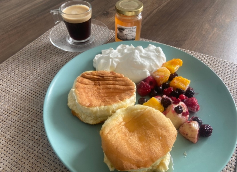 내가 주말 시간이 날 때 차려먹는 브런치라면 거의 항상 팬케이크다. 주로 만드는 것은 일본식 수풀레 팬케이크이다. 한번 유튜브로 영상을 봤는데, 지금까지 저 두꺼운 걸 어떻게 구워내지 했더니, 팬 위에서 물을 조금 부어주고 뚜껑을 닫아 쪄내듯 구워내더라. 그 방법으로 시도하니 퐁신퐁신한 수풀레 팬케이크가 쉽게 만들어졌다. 팬케이크와 내가 좋아하는 조합이라면 딸기이다. 봄철 딸기가 마트에 널려있을 때는 냉장고에 항상 딸기가 있었다. 내가 있는 프랑스의 딸기는 한국만큼 맛있진 않지만 그래도 딸기라서 좋다. 그런 딸기와 곁들이고 어떤 날은 크림까지 곁들여 먹는다. 보통은 다른 시럽이 아닌 꿀을 곁들여 먹는다. 클라우드 모네의 정원인 지베르니 정원에 갔다가 그 정원의 꽃에서 나온 꿀을 팔기에 한 병 사 왔었다. 평소 꿀을 잘 먹지 않아 이런 브런치를 할 때 아껴뒀던 그 꿀을 함께 곁들여 먹는다.