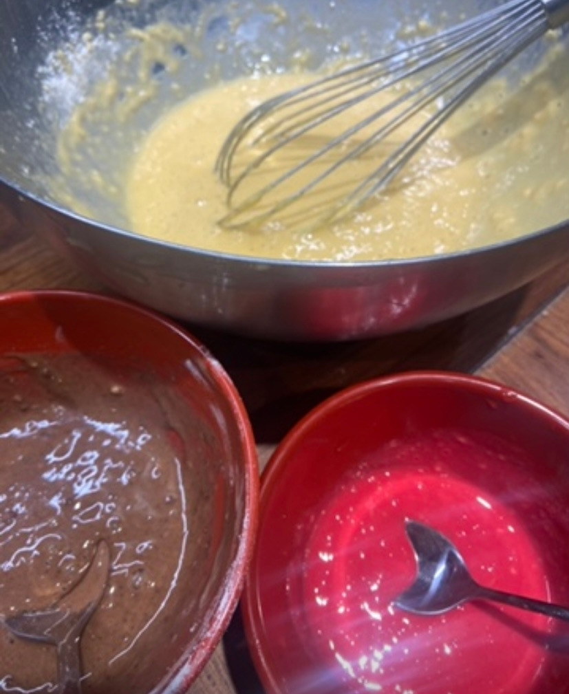 하루는 인터넷을 보다가 캐릭터 팬케이크를 보았다. 가끔 베이킹을 하는 터라 사다 뒀던 식용색소들이 있어서 어쩐지 나도 귀여운 팬케이크를 만들 수 있을 것 같았다. 비록 파랑, 빨간, 노랑 세 가지 색뿐이지만 말이다. 이 정도면 단순한 캐릭터는 만들 수 있을 듯싶었다. 영상을 보니 만들기는 쉽더라. 반죽을 나눠서 각각 식용색소를 넣어 색을 만들어준다. 그런 후, 반죽을 모두 짜는 주머니 같은 팩에 담아준다. 진한 색이 나와야 하는 테두리 부분은 제일 먼저 팬 위에서 그려내 주어 오래 익혀 진한 색이 나오게 하는 거다. 반죽을 나눠 색을 내주고는 짜는 주머니가 없으니 지퍼백에 담는다. 지퍼백을 테이프로 어찌어찌 만들어서 짜는 주머니 모양새를 흉내 내본다. 그럴듯하게 준비가 됐다.