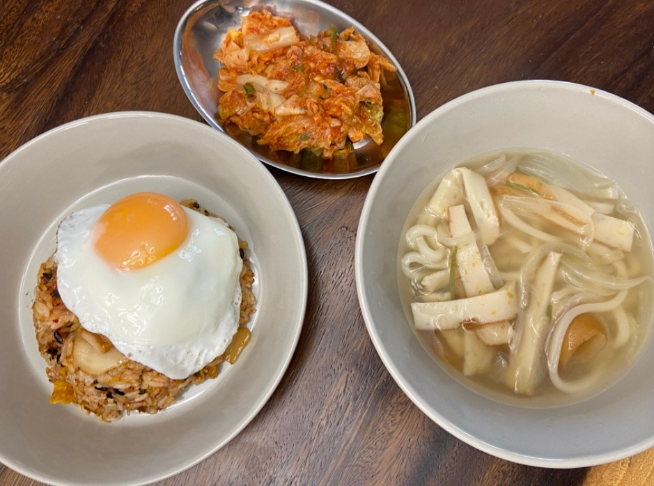 김치볶음밥을 하면서도 한편으로 매울까 걱정되어 냉장고의 어묵을 꺼내 멸치, 다시마로 육수를 내어 어묵을 잘라 넣고는 국간장, 멸치액젓으로 맛을 낸 어묵국을 끓여 준비한다. 김치볶음밥을 만든다. 기름을 두르고 김치를 잘게 잘라 볶아준다. 여기에 이제 데우지 않은 햇반의 껍질을 벗기고 그대로 넣어 볶아준다. 볶음밥을 할 때에는 햇반을 데울 필요가 없다. 오히려 데우지 않아야 밥이 고슬고슬하게 맛있게 볶아진다. 김치볶음밥은 크게 할 게 없다. 이미 김치가 모든 맛을 가지고 있기 때문이다. 다만 너무 신김치인 경우, 여기에 설탕을 조금 넣어주고 조금 더 자극적으로 먹고 싶다면 약간의 고추장과 참기름을 넣어주면 마치 삼겹살 후에 볶아먹는 그 볶음밥과 같은 맛이 된다. 나는 조카들을 위해 고추장을 넣지는 않았다. 오늘은 완전 기본 김치볶음밥이다. 역시 시작은 오리지널이니까 말이다. 그런 후, 계란을 예쁘게 프라이 해서 얹어주고 완성한다.