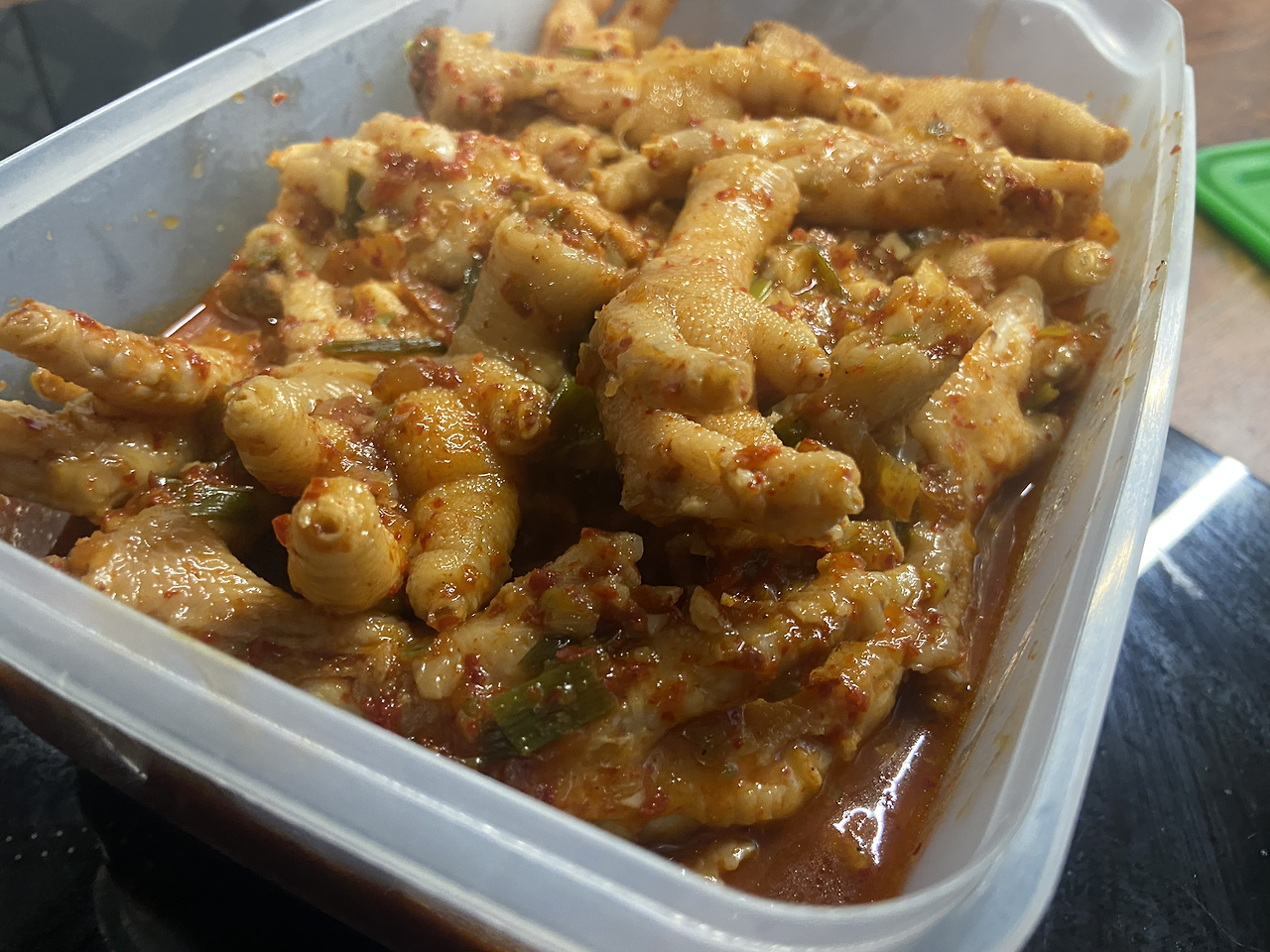 닭발은 시간상 미리 만들어둬서 당일에 출근 때 가져가 냉장고에 보관 후, 퇴근 후 약속장소로 가기로 했다. 평일 저녁 퇴근 후, 닭발을 조리했다. 먼저 출근 전 냉동 닭발을 냉장고에 해동되게 넣어두고 갔다. 퇴근하고 돌아와 냉장고에서 서서히 해동된 닭발을 꺼내든다. 발톱을 잘라내야 한다. 닭발조리에서 가장 혐오감이 드는 순간이다. 손톱깎이를 이용한다는 사람들도 있지만, 손톱깎이가 내가 쓰는 것 하나뿐이라 닭발에게 양보할 수 없다. 그러니 칼로 하나하나 잘라내준다. 닭발의 발톱을 자르는데 부엌에 룸메가 들어와서 냉장고를 연다. 프랑스인 룸메가 보면 식겁할 수 있으니 등으로 닭발을 최대한 가리고 인사만 한다. 발톱 손질은 징그럽기도 하고 너무 귀찮다. 닭발이 왜 이렇게 많나 싶다. 계속 자르고 또 잘라낸다. 그렇게 손질된 닭발은 먼저 생강가루와 된장을 한 스푼 풀어놓은 물에 10분 정도 삶아주었다. 그런 후, 깨끗하게 씻어내고 다시 물을 부어 15분 더 삶아주었다. 모두 부드러워졌다. 같이 먹을 사람들이 국물닭발을 원했기에 이 육수의 절반만 덜어내고 남은 절반이 있는 채로 양념을 넣어 섞어준다. 고춧가루, 간장, 설탕, 다진 마늘, 생강으로 맛을 낸다. 그런 후 양념을 넣고 섞어준 후 잠시 그대로 10분가량 둔다. 마지막으로 5분간을 다시 끓여내 주고, 통에 담아 식힌다. 식으면 육수에 닭발의 콜라겐성분에 의해 모두 젤처럼 굳어져있다. 식은 닭발을 냉장고에 보관해 둔다.