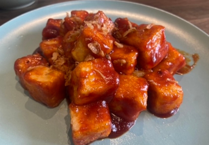 한국인이라면 보통 냉장고에 고추장은 있기 마련이다. (없으면 다음 메뉴로 가자. 장류는 비싸다.) 고추장, 케첩에 설탕 또는 물엿 약간, 간장 조금, 다진 마늘이면 양념치킨 소스를 ㅁ나들 수 있다. 두부를 깍둑썰기하여 준비한다. 두부에 골고루 전분가루를 입혀준다. (전분가루는 안 비싸다.) 기름을 둘러 준 팬에 두부를 전부 바삭하게 구워내 준다. 그렇게 바삭하게 구워진 두부에 양념치킨 소스를 찍먹 하거나 부어서 버무려준다. 버무리면 바삭함은 바로 사라지긴 한다. 하지만 그래도 맛은 있다.