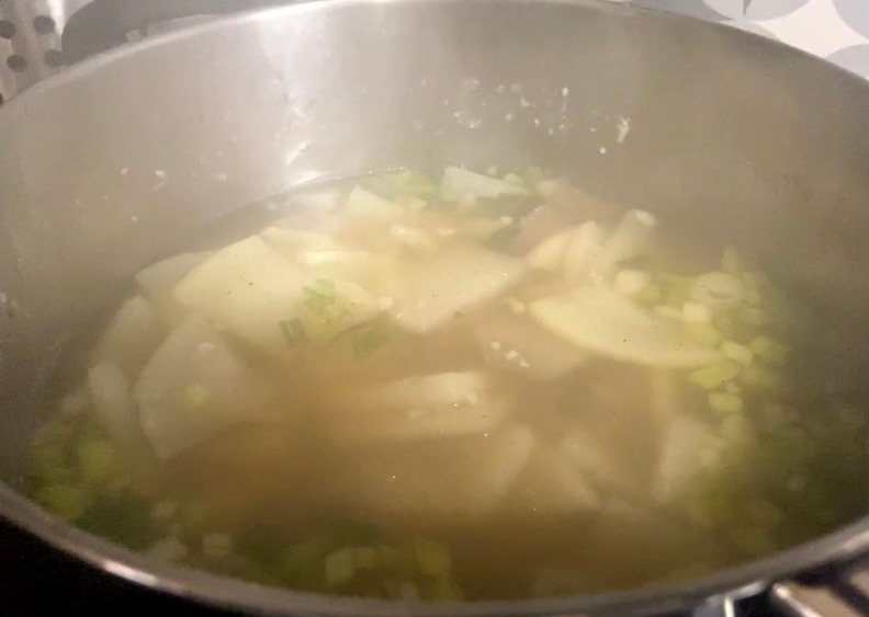 무는 제일 작은 걸로 사 오자. 무를 얇은 네모로 썰어 준비해 준다. 고기육수에 고기와 무를 넣고 함께 끓여준다. 국간장과 액젓으로 간을 해주고, 다진 마늘, 다진파를 넣어 끓여내주면 완성이다.