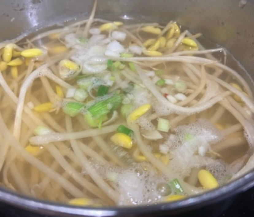 콩나물 국이다. 간단하게 끓인다면, 콩나물을 넣고 삶듯이 끓이고는 다진 마늘, 다진파를 넣고 소금간만 해도 된다. 감칠맛을 위해서는 새우젓을 넣어도 좋다. 좀 더 진한 육수를 원한다면 한국인의 기본 육수, 멸치와 다시마로 진하게 육수를 내주자. 육수를 내고는 그 육수에 콩나물을 삶아 콩나물 국을 만들어낸다. 냉장고 속에 김치가 있다면 김치를 곁들이자. 단백질이 부족하다면 다른 끼니때 단백질을 챙겨 먹으면 된다.