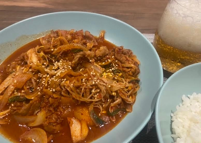 콩불! 고기는 소량 넣고, 콩나물로 배를 채워보자. 고기가 들어가면 국물로 고기육수가 나오면서 맛있어지니까, 콩나물을 얼마든지 먹을 수 있다. 간장, 설탕, 고춧가루, 다진 마늘을 섞어 양념을 준비한다. 소고기여도 좋고, 돼지고기여도 좋다. 콩나물을 바닥에 깐다. 고기를 위에 얹고 소스를 그 위에 뿌려준다. 뚜껑을 닫는다. 콩나물에서 물이 나오면 함께 섞어준다. 파도 썰어 얹어준다. 잘 뒤섞어준 후, 밥과 함께 먹는다. 맛있다.