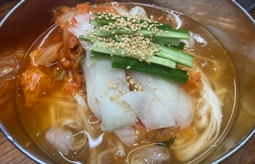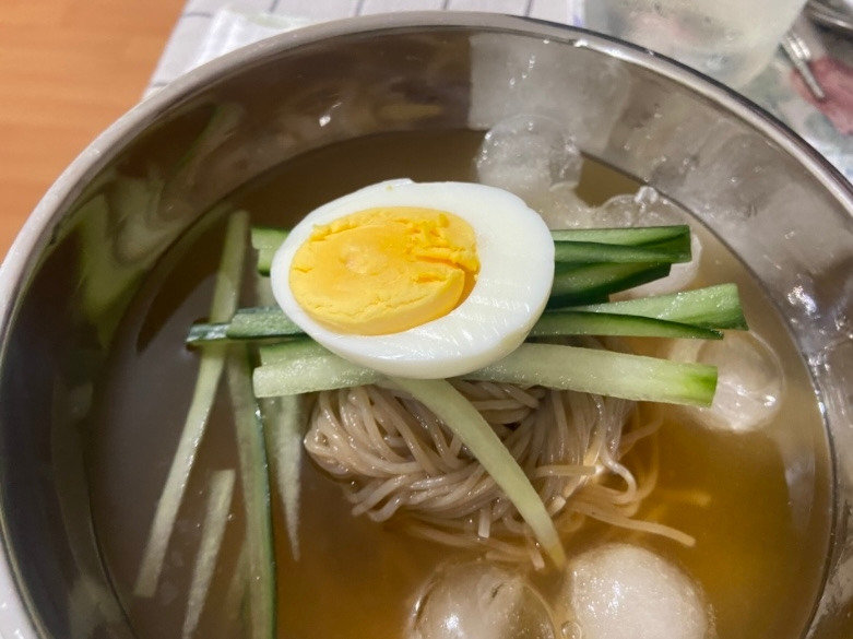 냉면면은 마트에서 저렴하게 살 수 있다. 냉면면은 익기도 빨리 익어서 배고플 때 급히 먹기 좋다. 단백질로 계란을 삶자. 계란이 얹어있지 않은 냉면은 너무 못생겨서 먹음직스럽지 않다. 고명은 간단하게 저렴한 오이로 대체한다. 오이를 채 썰어 얹어주고, 삶은 계란 반절 얹어주면 색감으로도 그럭저럭 먹음직스럽게 보인다.