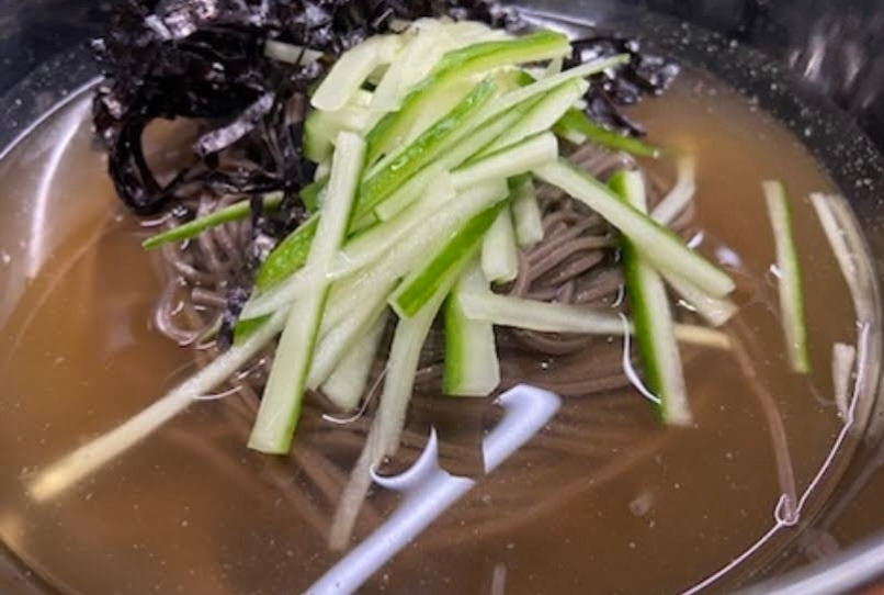 메밀면을 산다. 면을 삶아 헹군다. 냉면육수를 붓고 오이고명을 얹고 집에 남아있는 김을 가루내어 얹는다. 함께 먹는다.