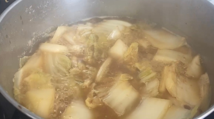 배추가 저렴한 경우 배추를 하나 사오자. 육수에 배추를 잘라넣고 된장을 풀어 끓여준다. 국간장을 조금 넣어주고 청양고추를 약간 넣어주면 더 맛있다.