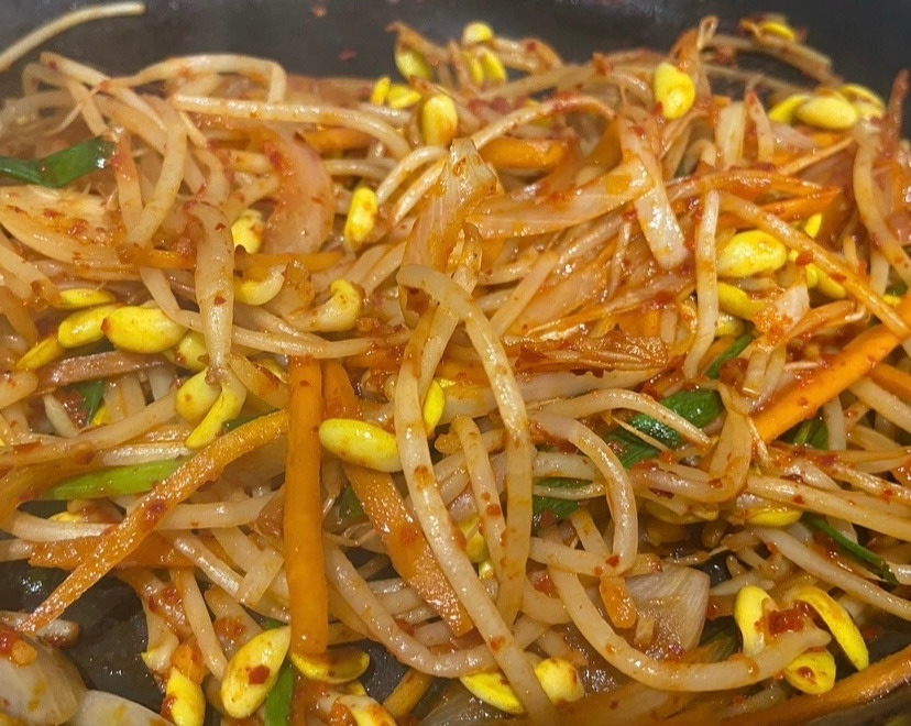 우리 엄마 시그니처 반찬이다. 콩나물을 데쳐낸다. 팬에 콩나물을 다시 넣고, 간장과 고춧가루를 넣고 물을 살짝 넣은 후 조려준다. 입맛 돌게 해주는 맛깔난 반찬이다.