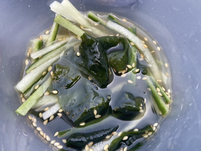 미역을 물에 불려둔다. 오이를 채 썬다. 냉면육수를 붓는다. 시원하게 먹는다.