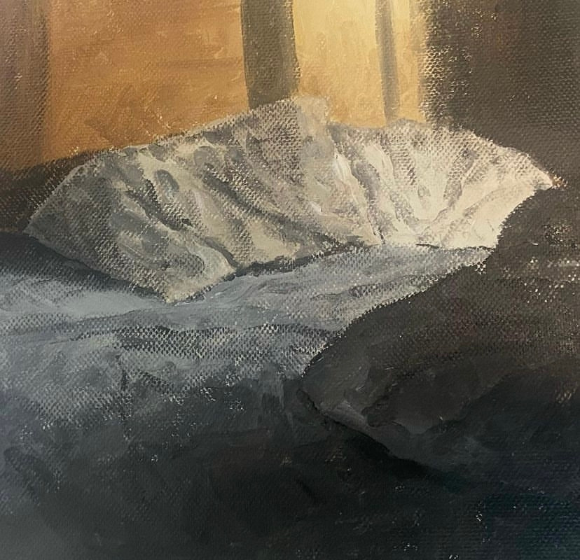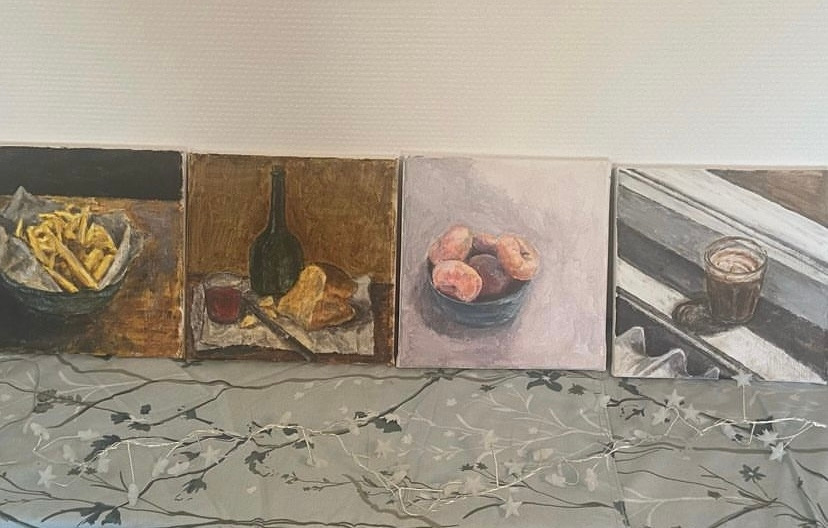 저작권프리 사진들을 인터넷에서 찾아보면서 원하는 것들을 핸드폰에 저장해 둔다. 그러고는 매일 아침, 그 사진들 중 그리고 싶은 것을 골라 그린다. 복숭아, 감자튀김, 창틀의 커피, 햇빛이 비추는 침대 등을 그린다. 작은 캔버스라 침대 헤드에 나란히 전시해 두니 제법 그럴듯하고 뿌듯하다.