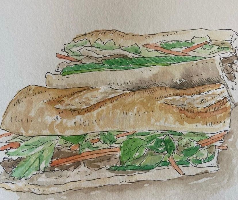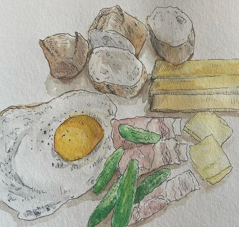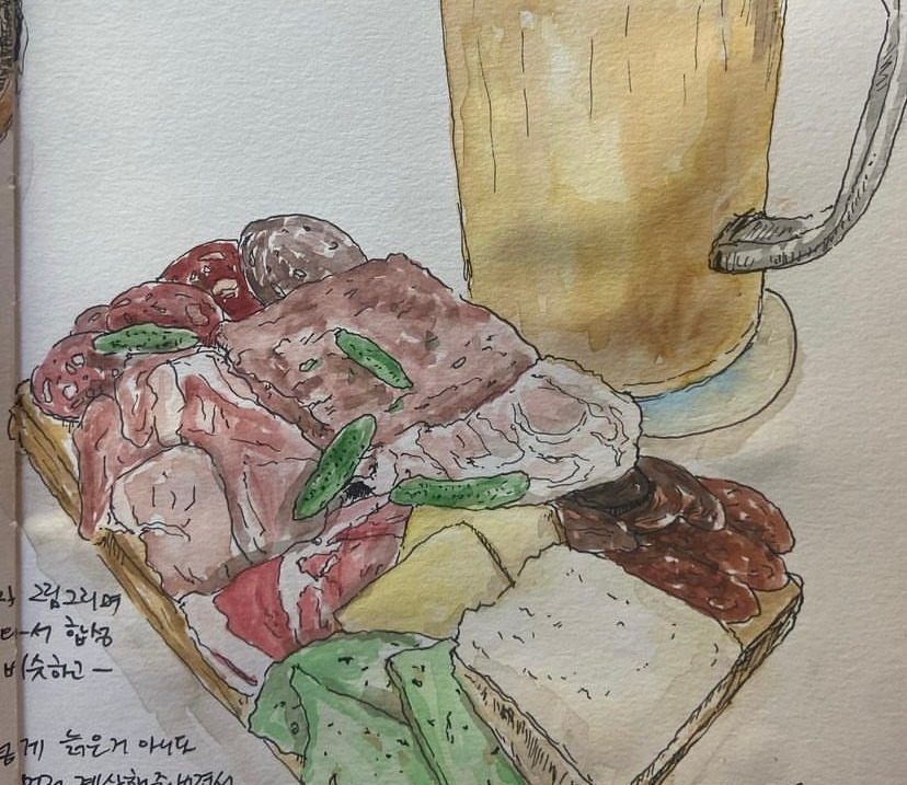 한참 건물 드로잉을 하다가 또다시 질려서 잠시 손을 놨다. 그 후에는 여행을 다녀와서, 저널 드로잉을 조금 한 후로는 한동안 붓을 잡지 않았다. 그림을 그리지 않은지 몇 달의 시간이 흐르고 흘렀다. 서랍을 정리하다가 서랍 한가득 그림도구들이 있는 것을 보고는 다시 그림을 그려보자 싶었다. 스케치북에 펜으로 최근에 먹었던 것을 그리고는 기존에 가지고 있던 수채물감으로 색칠을 해본다. 오래간만에 그리는데 나쁘지 않게 그려진 듯했다. 그림이 원하는 대로 그려지니 다시 재미를 느꼈다.
