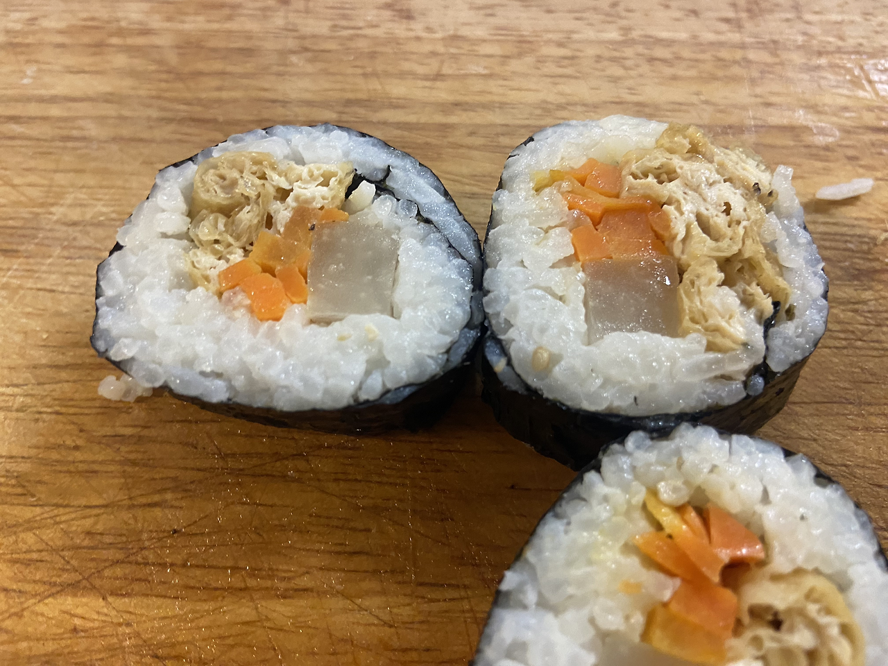 이제 김밥을 차례다. 먼저 다 된 밥을 보여준다. 밥의 찰기가 있어야 한다고 밥을 손으로 으깨주며 보여준다. 맨 밥을 맛보게 하고, 참기름과 소금으로 간을 한 후, 다시 맛을 보게 한다. 그런 후, 김밥 재료들을 준비하기 시작한다. 통단무지를 직접 자르게 시켜본다. 오이도 자르게 시킨다. 다들 시키는 대로 잘해준다. 그런 후, 당근을 채 썰어야 하는데, 칼이 너무 안 든다. 엉성한 칼질이 된다. 양해를 구하며 어찌어찌 당근까지 채 썰기를 마무리한다. 계란 지단을 대충 부쳐내 준다. 어차피 칼로 잘게 썰어줄 거라 예쁠 필요가 없다. 설거지를 더 안 하기 위해 계란을 먼저 익히고, 이후 당근을 볶아내 준다. 그런 후, 비건용을 위해 잘게 썰어준 유부에 간장:설탕=3:2를 넣고 물을 살짝 넣어 조려준다. 잠봉(햄) 사 온 것도 잘라 준비하고, 참치캔도 따서 참치마요도 만들어 준다. 챙겨 온 김치도 꺼낸다. 치즈까지 꺼내서 김밥 쌀 준비를 모두 끝낸다.
