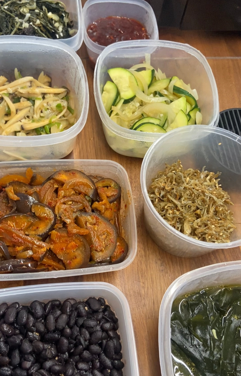 다른 반찬들을 준비한다. 삶아준 건취나물에 멸치액젓, 다진 마늘, 참기름, 다진파를 넣고 조물조물 버무려준다. 맛을 본다. 오래간만에 먹는 나물이 맛있다. 자투리 호박도 잘라서, 양파와 함께 볶아내며 새우젓으로 간을 해줘 호박볶음도 완성한다. 약간의 버섯도 잘게 잘라주고는 볶아 준비한다. 버섯은 소금으로 간해준다. 불려뒀던 검은콩을 거의 30~40분 익혀내고는 간장, 국간장으로 간을 하며 한번 더 익혀주고, 식힌 후 물엿과 설탕, 참깨를 넣어 콩자반도 완성한다. 냉동실의 잔멸치도 꺼내 먼저 볶아주며 비린내를 좀 날려내 주고, 간장을 넣어 볶아준 후, 한 김 식혀 물엿을 넣고 버무려준다. 짭짤 달콤한 단짠 멸치볶음 완성이다. 거의 열흘 전에 독일에서 사 왔던 미니 가지가 아직도 싱싱하다. 잘라서는 고추장, 간장, 약간의 설탕, 참기름에 함께 볶아줘서 밥반찬을 만든다. 마지막으로 자투리 소고기를 잘게 다지고, 다진 파, 다진 마늘, 간장에 고추장을 함께 볶아 볶음고추장을 완성한다. 냉장고에 한가득 다음 주 반찬이 가득 찼다.