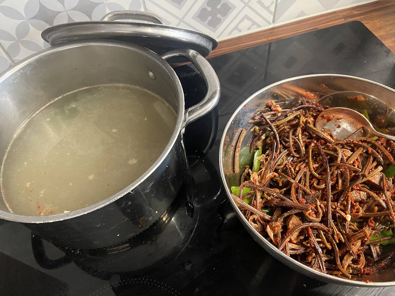 그다음으로는 남은 소고기를 약간 자투리만 잘라 따로 보관하고 (볶음고추장용) 덩어리채 물에 넣고 육수를 내준다. 육수가 끓여지는 동안 한편에서 나물들을 삶는다. 건고사리와 건 취나물은 10시간 가까이 물에 불려주었다. 이제 끓는 물에 20분간 삶아주면 부드러워진다. 그렇게 삶아지면 찬물에 헹구고 물기를 쫘악 짜서 준비해 준다. 끓는 고기 육수에 잘라둔 파를 데쳐내 준다. 고기 육수가 준비되면 고기도 건져내 준다. 잘라준 고기, 데친 파, 먹기 좋은 크기로 준비한 삶은 고사리를 그릇에 담고, 고춧가루, 국간장, 다진 마늘, 약간의 육수로 조물조물 준비해 둔다. 양념이 배어들 시간을 좀 더 주는 거다. 그런 후, 끓여둔 육수에 버무려둔 재료들을 넣고 끓인다. 어느 정도 끓여지면 간을 본다. 고기양이 적었으니 육수가 진하지 않다. 다 방법이 있다. 치킨파우더를 찬장에서 꺼내든다. 듬뿍 한 스푼을 넣는다. 다시 좀 끓이고 맛본다. 음~파는 맛이다. 여기에 풀어둔 계란 2개를 넣어 저어주면 육개장이 끝났다.