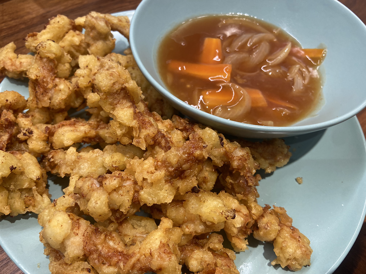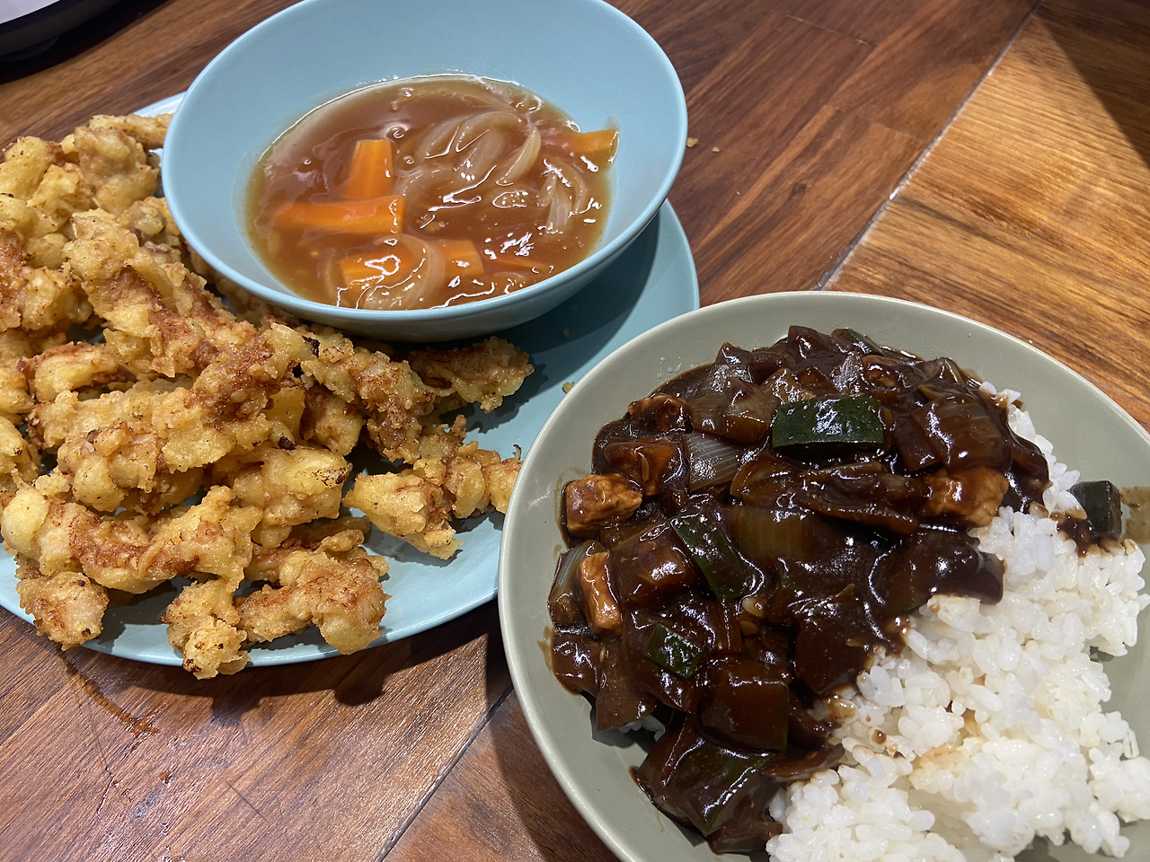 고기가 튀겨진 것을 맛본다. 맛있다. 소스도 따로 맛보니 맛있다. 짜장면을 위한 면을 익힐까 하다가 남은 밥이 생각나서 그냥 짜장밥으로 먹기로 한다. 탕수육은 찍먹/부먹 따로 가리지 않지만 오늘은 튀김이 바삭하니 찍먹으로 가기로 한다. 고기를 밑간을 해서인지 그냥 집어먹는데 맛있다. 고기튀김 같다. 짜장밥도 그릇에 담아 함께 내니 집에서 간단하게 탕수육과 짜장법 한 상이 완성되었다. 탕수육 소스에 고기를 찍어 먹어본다. 고기자체에 밑간이 충분히 되어서인지, 탕수육 소스의 맛을 살려주지 못하는 느낌이다. 전에 중식셰프가 탕수육 고기는 고기가 신선하면 고기 자체 맛을 위해 밑간을 안 하는 편이라 했는데, 그게 무슨 말인지 알겠다. 탕수육 소스 자체가 원래 맛이 강한 편이 아니라서인지, 탕수육 소스와 고기의 맛을 위해서는 밑간을 최소화하는 게 더 맞겠다 싶었다. 다음에는 원래 하던 레시피로 돌아가야겠다. 그래도 고기튀김은 맛있었다. 소스와는 조금 겉돌았지만, 튀김 자체가 맛있어서 다 먹어버렸다. 먹고 싶었던 요리를 해서 욕구를 충족시키니 만족감이 더 컸다. 역시 먹고 싶을 때 먹는 요리가 더 맛있는 법이다.
