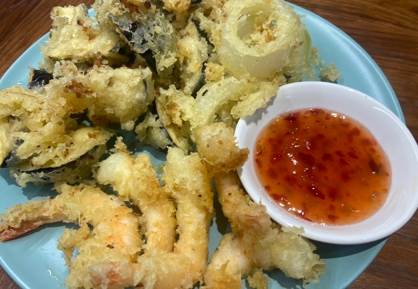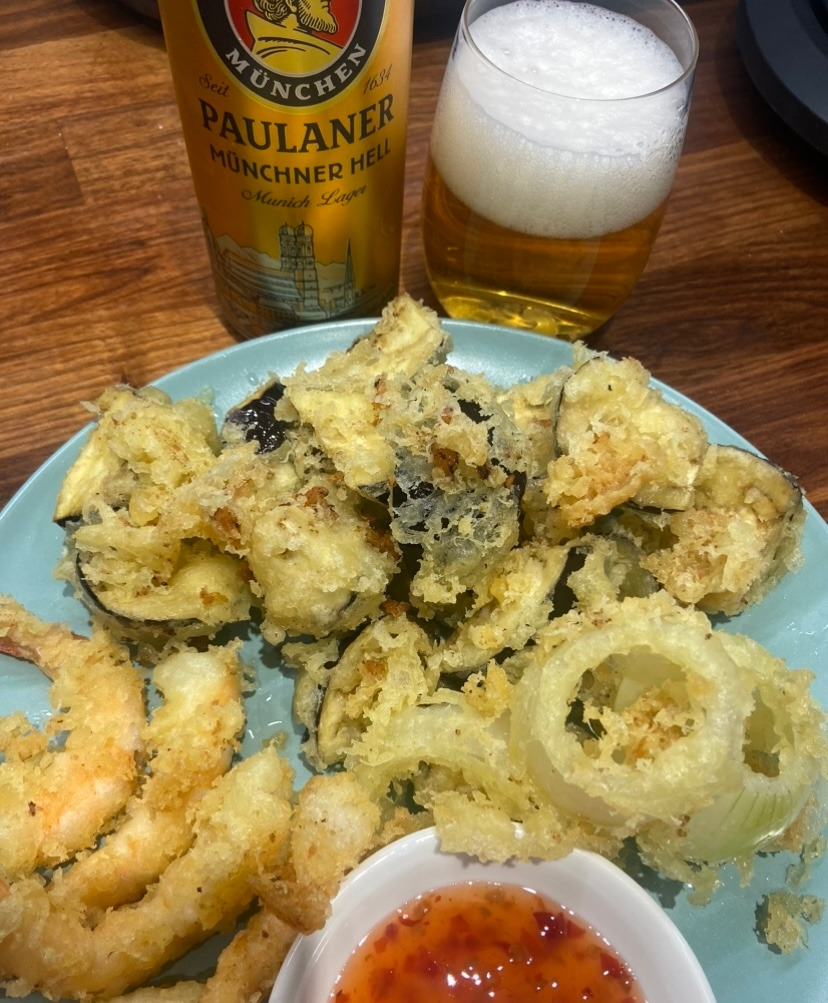 튀김반죽을 만든다. 튀김가루를 꺼내고는 물을 넣어 반죽을 만든다. 일본식 튀김 느낌으로 할 거라, 꽤나 묽은 농도로 만든다. 조금은 걸쭉한 미숫가루 같은 농도로 반죽을 만든다. 먼저 마른 튀김가루로 가지, 양파, 새우의 겉면을 모두 묻혀준다. 그런 후, 기름을 올린다. 기름 온도가 올라가면, 마른 가루가 묻은 재료를 묽은 반죽에 묻힌 후 기름에 투하한다. 냄새가 나지 않는 가지부터 튀기기 시작한다. 수분이 많아서, 기름에 넣자마자 촤아아악하면서 기름 겉면에 반죽들이 퍼져나간다. 그렇게 조금 튀겨지는 가지에 둥둥 떠다니는 튀김 반죽 근처로 가져가서 반죽이 붙게 만들어준다. 이렇게 하면 꽃이 핀 것 같은 튀김이 완성된다. 가지를 튀겨준 후, 양파를 튀겨주고 마지막으로 새우까지 튀겨내 준다. 소스를 만들기엔 튀김이 얼른 먹고 싶고 배고파서 냉장고 속 스위트칠리소스로 대충 해결한다.