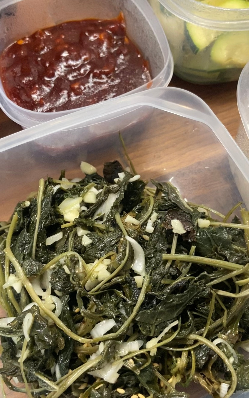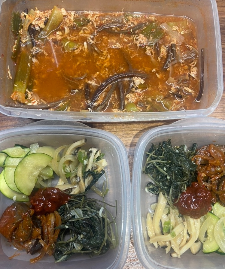 이렇게 모든 요리가 간단히 끝났다. 2시간 만에 국 2종류에 각종 나물이 완성되었다. 한 주가 풍성해질 것 같았다. 원래는 혼자 먹을 생각이었다. 육개장을 먹으니 맛있어서 혼자 먹기 아까웠다. 나의 요리실력을 좀 뽐내고 싶었다. 그러고는 나물들에 계란 프라이를 얹어 볶음고추장으로 비빔밥을 해 먹었더니, 오래간만에 제대로 건나물도 들어가니 비빔밥이 정말 맛있었다. 이것도 혼자 먹기 너무 아쉬웠다. 그 전주에 김치 나눔을 했던 한국인 지인들에게 다시 연락한다. 육개장과 비빔밥 먹겠느냐고. 다들 YES를 외쳐주었다. 기쁜 마음에 비빔밥 도시락과 육개장을 통에 담는다. 약속을 잡고는 저녁에 도시락을 건네주었다. 혼자 먹어도 맛있지만 나눠 먹어야 더 맛있다. 요리를 나눌 사람들이 생겨서 기쁘다.