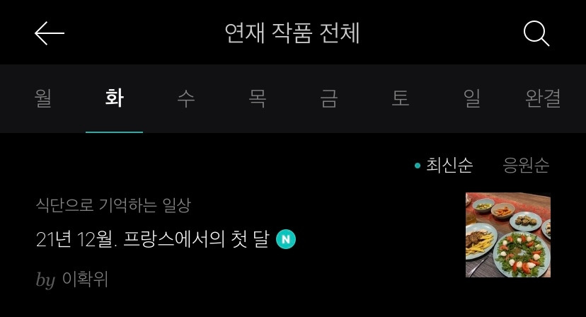 브런치에서 알림이 왔다. 오늘부터 나도 연재를 시작할 수 있다더라. 연재를 하지 않아도 어느 정도 꾸준히 글쓰기를 하고 있기는 하지만, 완성하고 싶은 시리즈가 있었다. 프랑스에 도착한 후의 전반적인 일상을 기록하고 싶은데, 예전에 블로그에 쓰다가 어느 순간부터 안 쓰게 된 내용이었다. 하나의 시리즈로 만들고 싶어 이걸로 첫 연재를 시작하기로 했다. “식단으로 기억하는 일상”이라고 급하게 제목을 정했는데 벌써 마음에 들지 않는다. 좀 더 신중할걸 그랬다.